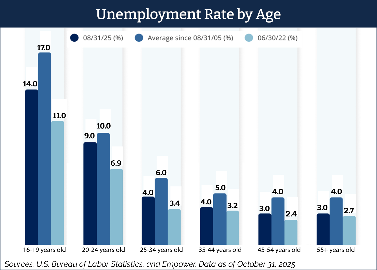 We review the unemployment rate by age. We find that while unemployment is below the 10-year average across all age categories, it has worsened meaningfully over the past three years, particularly for younger job seekers.
