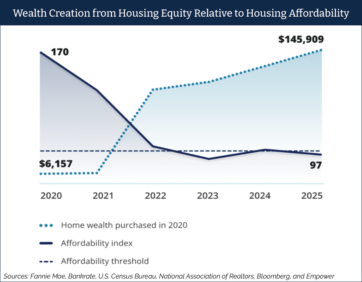 We compare the wealth creation from rising home price equity for homes purchased in 2020 relative to an index measuring affordability over the same period. The contrast is stark: Due largely to rising home prices, homeowners have seen a remarkable gain in wealth over this stretch. However, those looking to enter the market are looking at extremely low levels of affordability. A Housing Affordability Index of 100 indicates that a median-income household earns exactly enough to afford a median-priced home under standard mortgage terms. Values above 100 imply greater affordability, while values below 100 indicate that the median-income family lacks sufficient income to purchase the median-priced home.