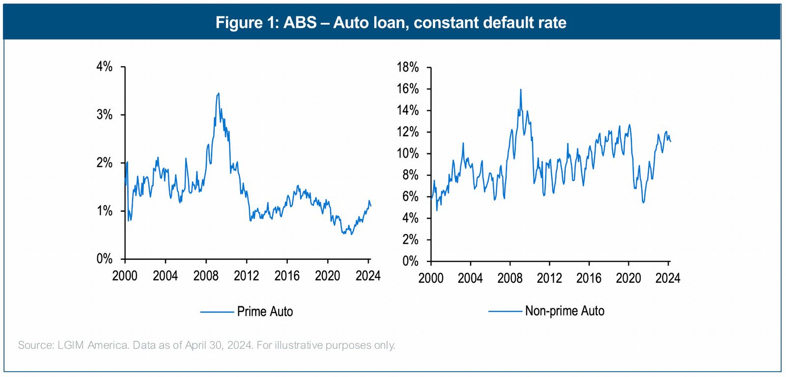 However, at first glance, certain risk metrics can screen concerning – for example, the time series in Figure 1 of auto loan defaults prime and non-prime loans increasing to 2% and 12%, respectively. But a deeper look reveals a different story.