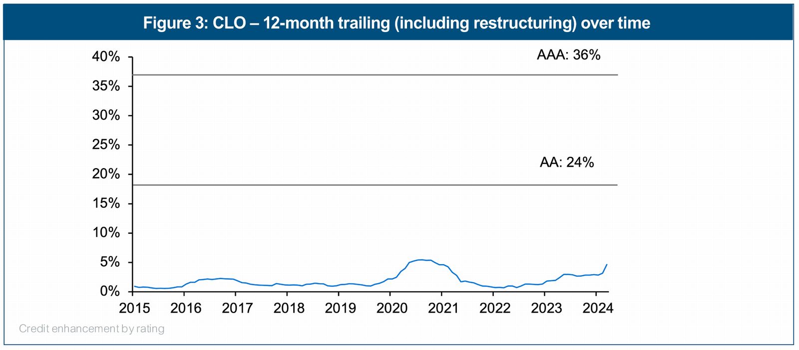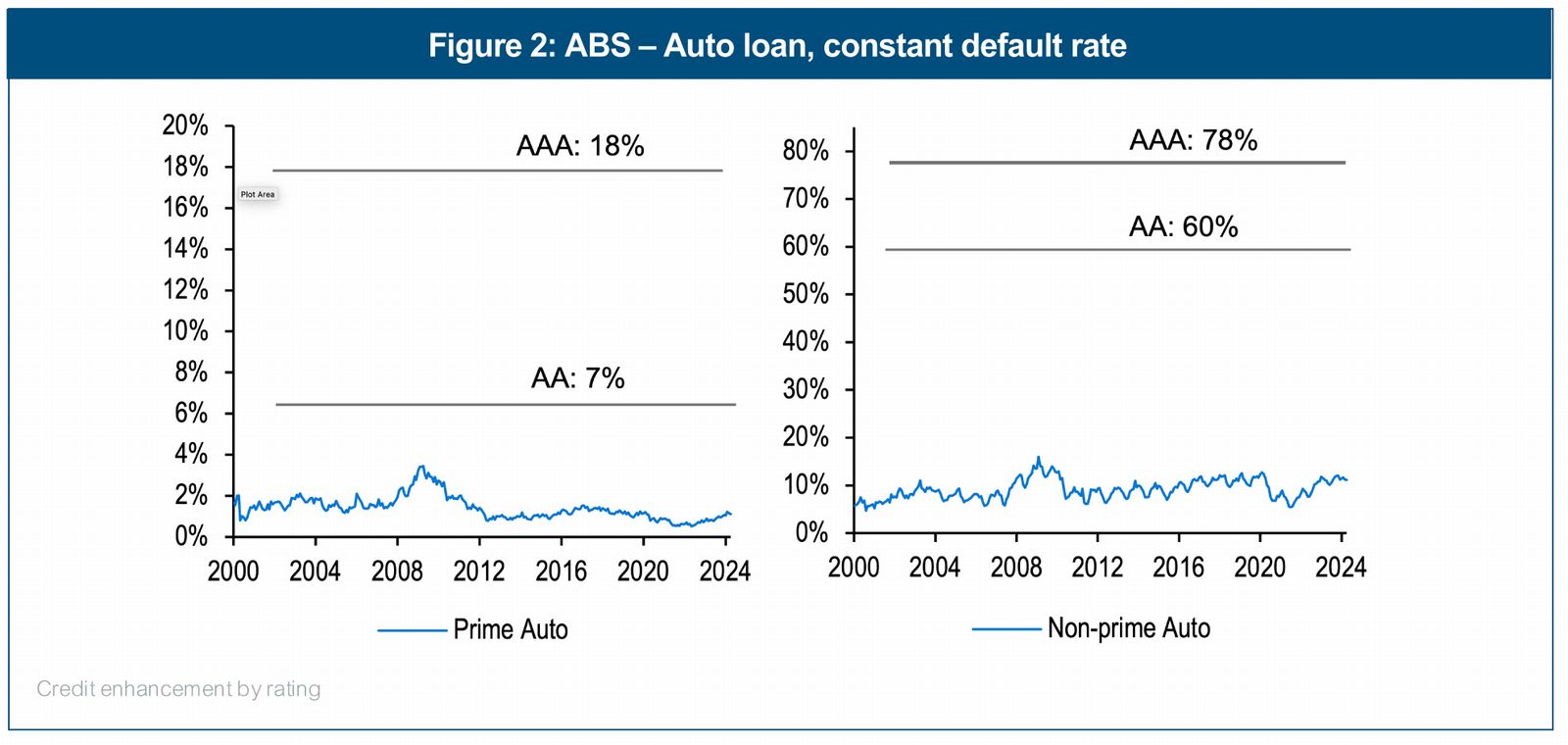 Figure 2 shows the same time series for auto loan defaults but this time we've overlaid recent credit enhancement levels for a given rating. We've also done the same with other securitized sectors (see Figure 3-4).