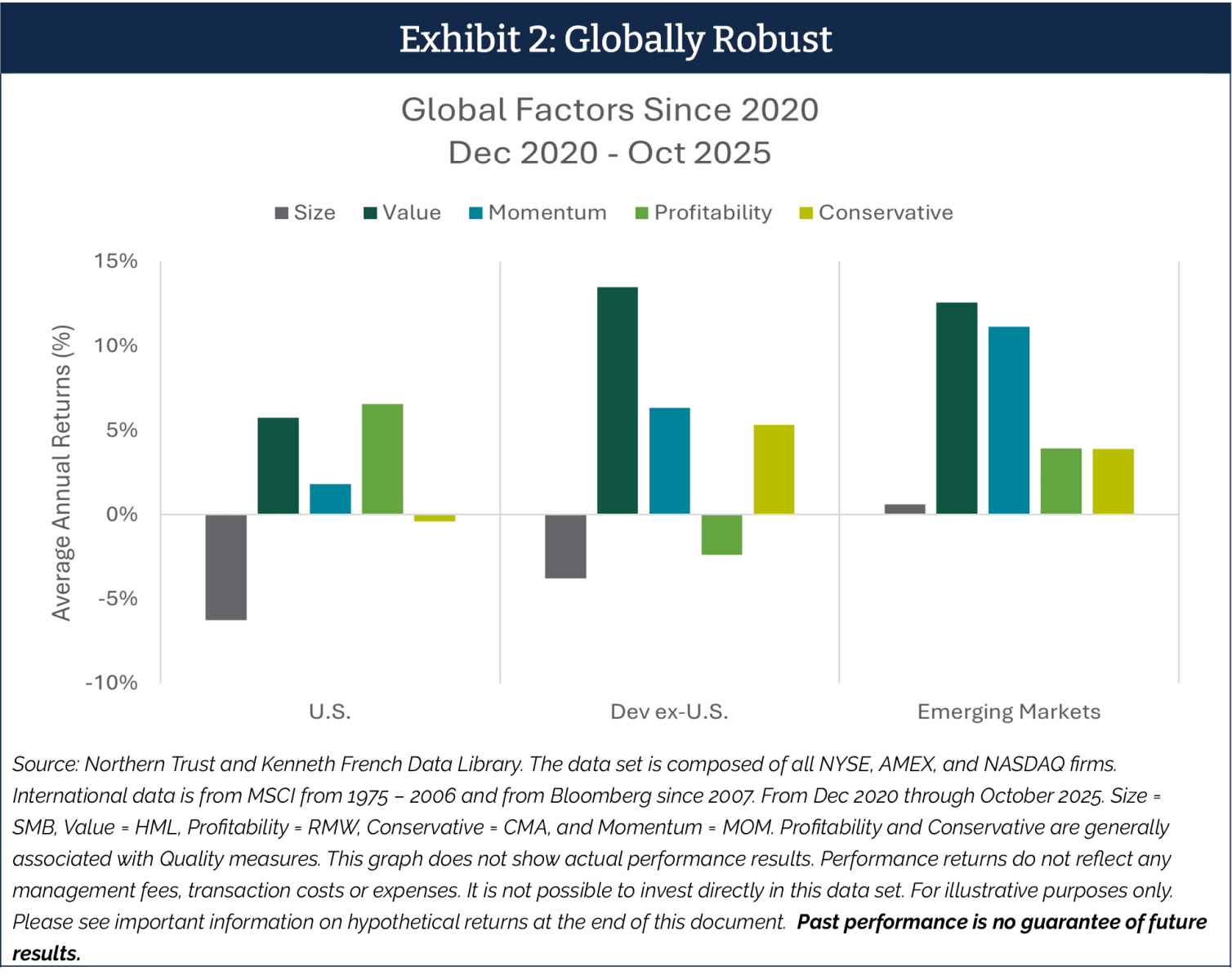 Over the past five years — since the moderation of the COVID crisis — systematic factors have delivered positive results globally. This strength is not confined to the U.S.; Developed Markets ex-U.S. and Emerging Markets have also seen meaningful benefits from exposures to quality, value, and momentum.