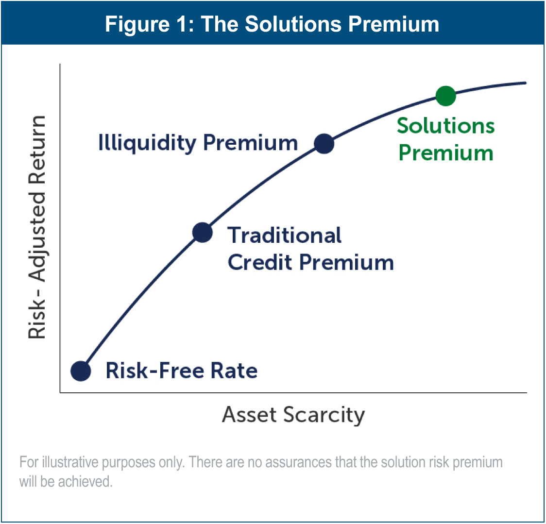 The investment appeal of capital solutions lies largely in the potential for attractive risk-adjusted returns with low correlation to traditional debt and equity markets. This stems from sourcing and structuring bespoke solutions to meet what are often idiosyncratic needs of companies. Through capital solutions investment strategies, managers— and by extension, investors—are positioned to capture the ‘solutions' premium that comes with providing bespoke financings into situations where the supply and demand of capital is favorable (Figure 1).