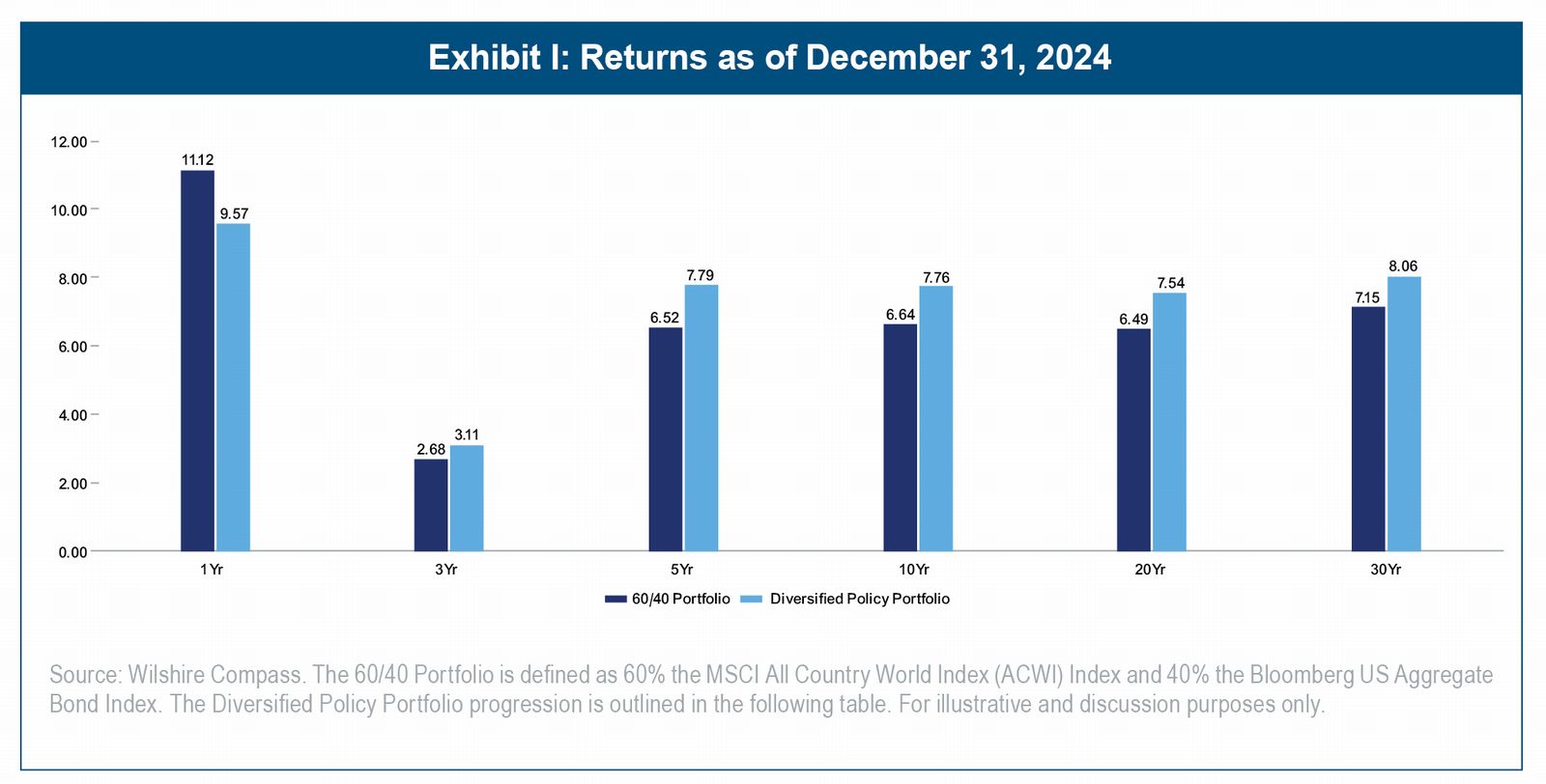 Wilshire has been formulating long-term (10-year) returns, risk, and correlation assumptions since the early 1980s.2 We believe that high current valuations are likely to lead to lower capital market return expectations over the next 10 years versus the last 10 years. Importantly, Wilshire's capital market assumptions forecast a 10-year return expectation of 5.32% for the 60/40 portfolio as of December 31, 2024. For many investors, this level of return will be unsatisfactory. Fortunately, a broader opportunity set of asset classes offers both more attractive returns and diversification which can improve portfolio efficiency and dampen volatility.