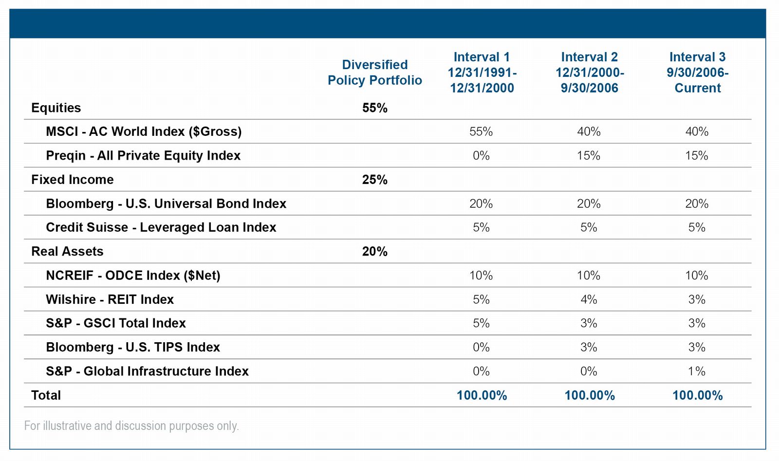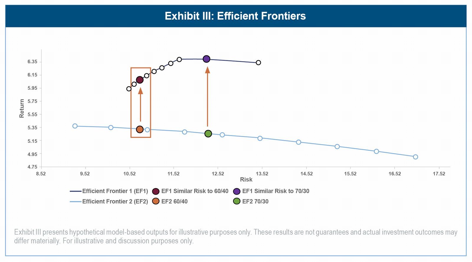 As shown in Exhibit II, a diversified policy portfolio with a similar risk level to the 60/40 portfolio increases expected returns by 74 basis points and improves portfolio efficiency by boosting return per unit of risk from 0.49 to 0.56. Moreover, we can broaden the comparison via a series of optimizations. Exhibit III presents two efficient frontiers. Efficient Frontier 1 (EF1) is an optimization of the array of asset classes shown in Exhibit II. Efficient Frontier 2 (EF2) optimizes only global equities and core bonds. From this analysis we see that at every risk level, a diversified policy portfolio (mapped on EF1) is expected to offer higher returns than the two-asset reference portfolio of similar risk (mapped on EF2). The box in Exhibit III highlights the return expectations of the 60/40 portfolio and the higher return expectations for the diversified portfolio of the same expected risk from the table in Exhibit II. As a point of comparison, we also plot a 70/30 portfolio with an even larger return premium for the diversified portfolio of the same expected risk. Importantly, these return expectations are model-based hypothetical projections derived from Wilshire's capital market assumptions. They rely on numerous assumptions regarding asset class behavior and correlations that may not materialize. Actual results may differ materially from these estimates. To the extent that active managers can add excess returns over their benchmarks, the total portfolio expected returns may be higher than shown in Exhibits II and III.