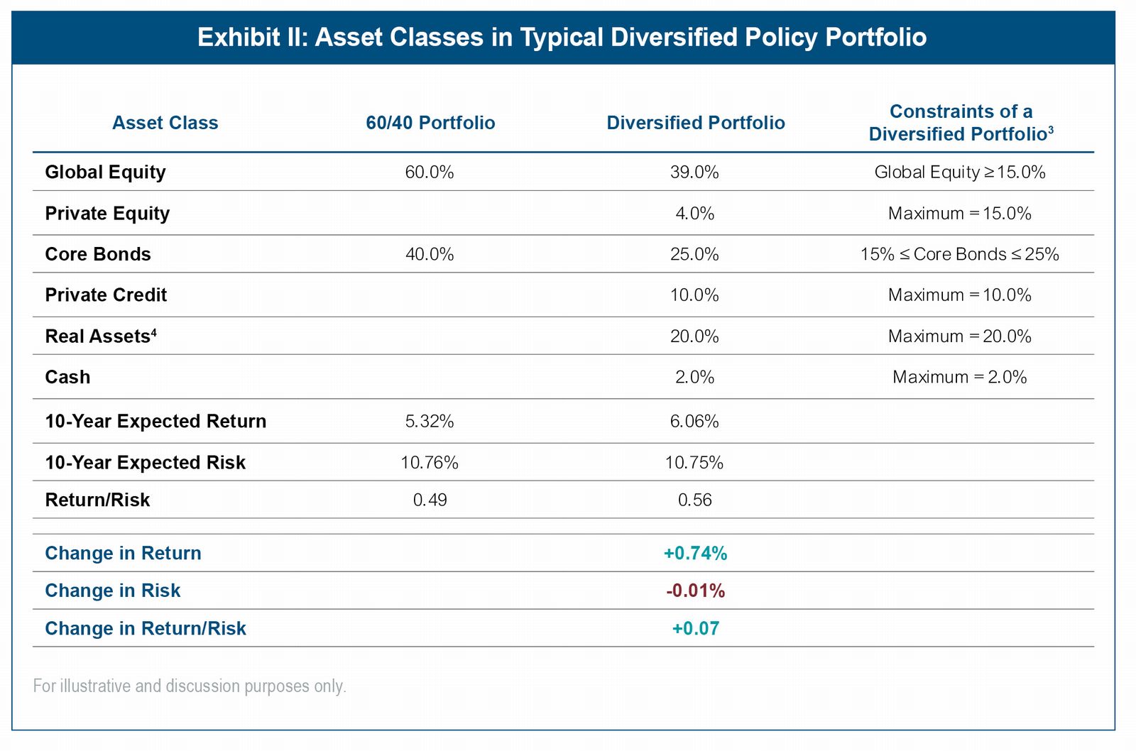For example, non-U.S. equities, non-core bonds, private assets, and a basket of real assets including real estate, infrastructure and commodities are projected to offer premiums to both U.S. equities and core fixed income. The table in Exhibit II details the array of asset classes that might be included in a typical diversified policy portfolio and the constraints used to generate the efficient frontiers shown in Exhibit III.