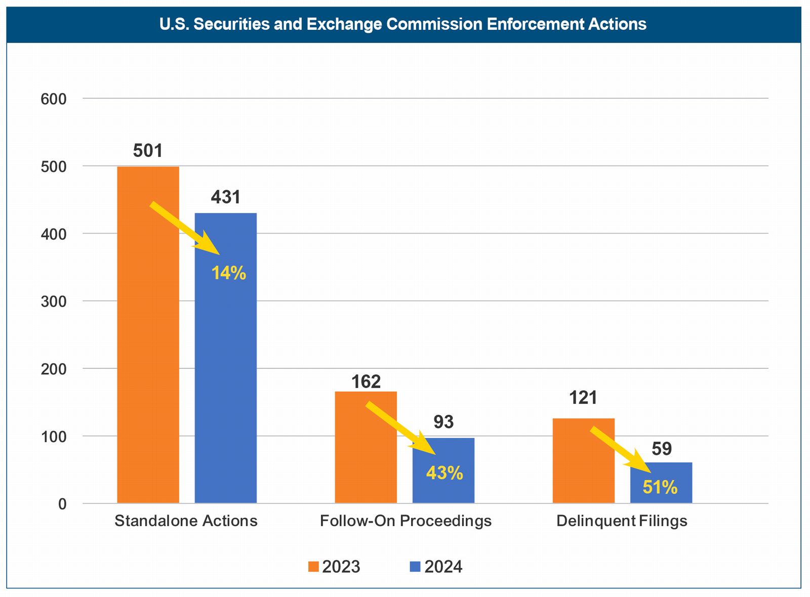 Recent enforcement data from the U.S. Securities and Exchange Commission (SEC) reveals significant declines across several key metrics. In 2024, the SEC filed 431 standalone enforcement actions—a 14% drop from 2023 and the lowest annual total in a decade, excluding the pandemic-disrupted year of 2020.i Follow-on administrative proceedings, which seek sanctions based on prior criminal convictions, civil injunctions, or regulatory orders, fell to 93—a 43% decline and the lowest in ten years.ii Similarly, the SEC brought just 59 delinquent filing cases against issuers, down 51% from 2023 and also a decade low.iii While the SEC recovered a record $8.2 billion in financial remedies in 2024, roughly 56% of that amount stemmed from one trial victory against Terraform Labs and Do Kwon, who were charged in one of the largest securities fraud cases in U.S. history.iv