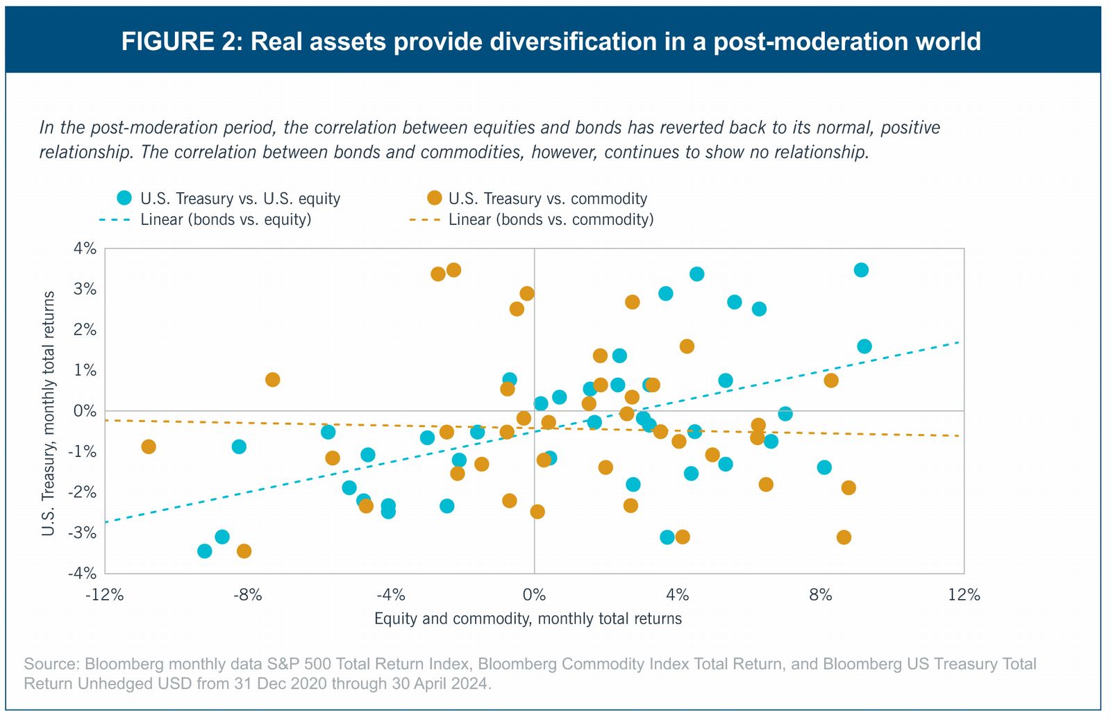 Many of the underlying risk factors that drive the value of real assets are unique. These idiosyncrasies, when combined with supply limitations, enable real assets to retain their portfolio diversification benefits in a post-moderation world where heavily financialized assets may have lost some luster.