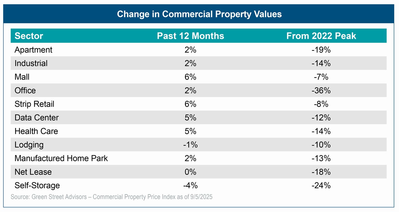 The current market correction that was primarily driven by the interest rate increases appears to have similarities to prior downturns, and this has created buying opportunities that could lead to outsized performance in future years. The table below shows commercial property prices over the past 12 months and the change from the 2022 peak pricing. As we can see, pricing is down today from the 2022 peak in all asset classes. The good news is that many asset classes have seen positive price improvements in the past 12 months. This appears to be an opportune time to buy real estate, as it seems we have reached the bottom in terms of pricing.