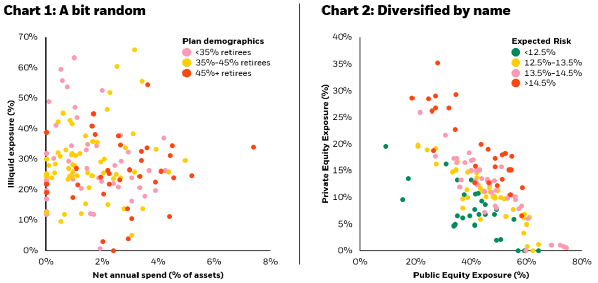 Source: BlackRock, PPD, P&I as of May 2025. Allocation metrics (average/range) and cohorting only includes plans that allocate to the asset class and may differ from metrics that include all plans. Chart 1. Net annual spend is calculated by netting contributions and benefit payments. A positive net annual spend indicates a negative net contribution/benefit payment position; plans with a positive net position are shown at 0% net annual spend. Chart 2. Risk: 84% confidence interval, 294 constant weighted monthly observations.