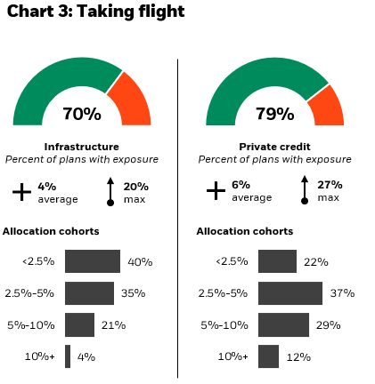 Our analysis uncovered two areas where plans have started introducing income-oriented exposures that can both diversify risk and enhance return potential: infrastructure and private credit. While the average actual allocation (which tends to be below target exposures) to infrastructure (4%) and private credit (6%) among those that allocate to these asset classes appears underwhelming on the surface, the growing popularity of these strategies and the depth of those that allocate establish a trend we expect to continue as plans evolve their journey both into and within alternatives. Across our coverage universe, 70% of plans currently allocate to infrastructure while 79% allocate to private credit; furthermore, a quarter of plans allocating to infrastructure and over 40% of plans allocating to private credit have invested over 5% of their portfolio to the respective asset class (chart 3).