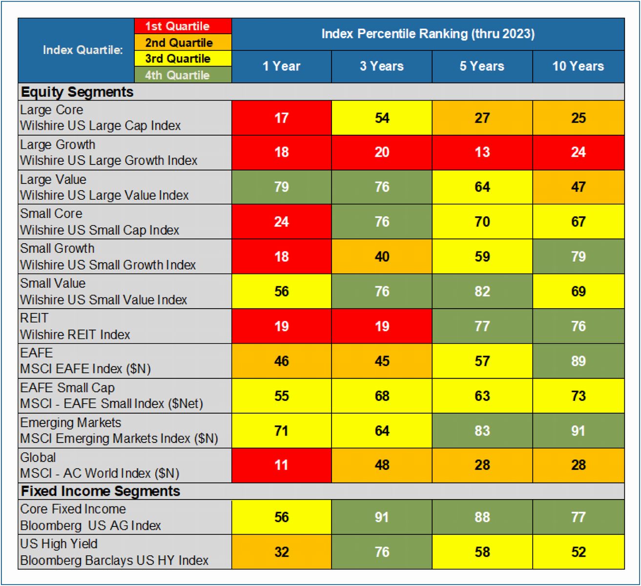Shifting to a review of the relative success of active management, the table below displays the overall ranking of the index within each market segment. In addition to showing the index percentile rank, the shading of the ranking informs us of the overall likelihood of active management's success for a particular universe and time period. A high ranking, colored in red, reflects a benchmark that performed well versus the universe of active investment managers whereas a low ranking, colored in green, represents a universe where a majority of the active managers added value of the respective benchmark.