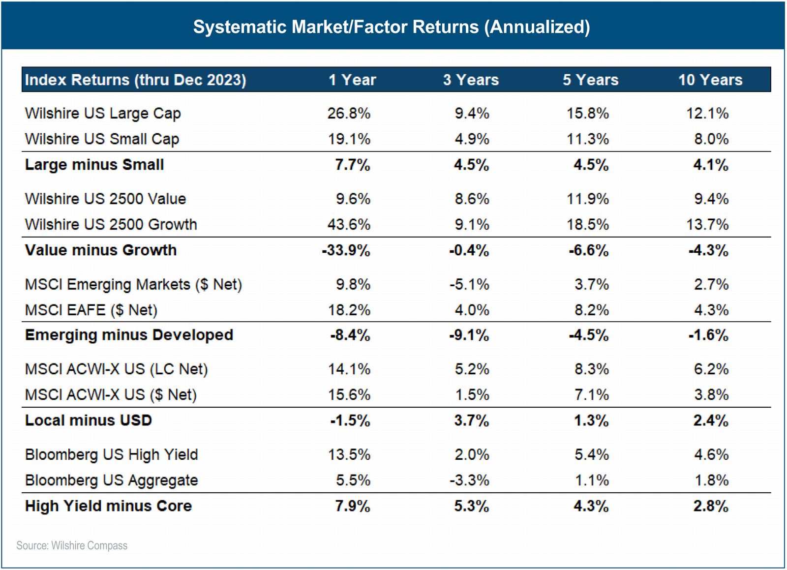 To no surprise of the reader, U.S. Equity markets have provided the strongest returns in all time periods across the asset classes displayed, with the large-cap and growth segments leading the way. Within equity markets outside of the U.S., the developed markets have reigned supreme over emerging markets in all four time horizons. Lastly, within fixed income markets, high yield markets have provided superior returns over the core bond market in all time periods. Further observations within each of these markets pertaining to factors such as style, quality, volatility, momentum, and currency are explored within the paper in greater detail.
