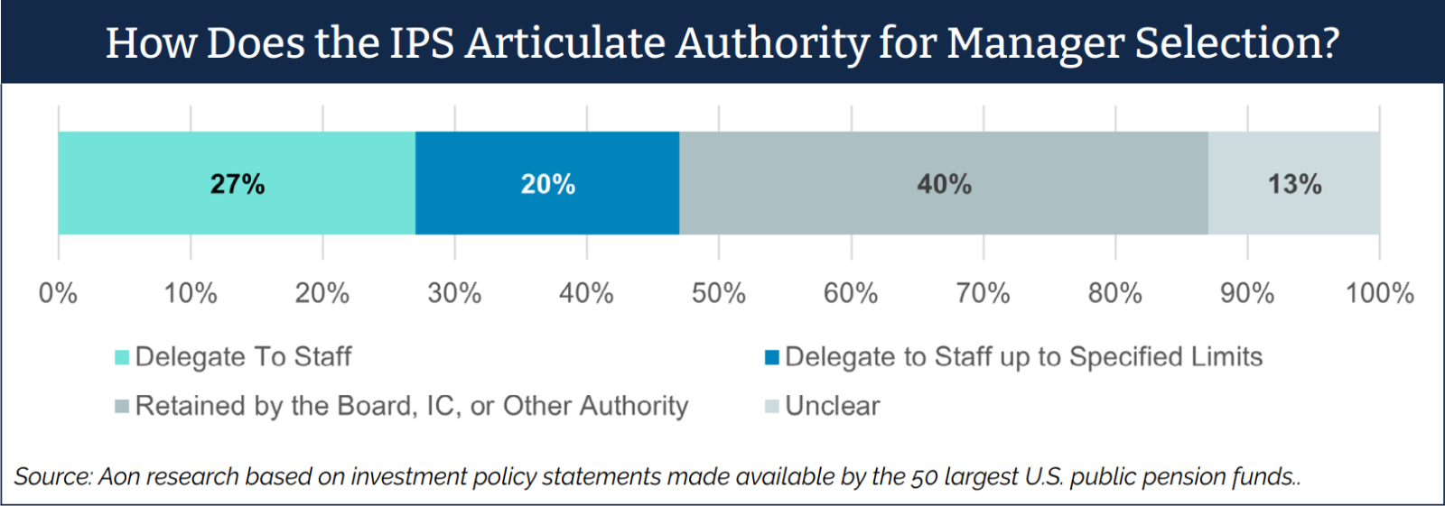Public pension trustees have a crucial role in the oversight of plan assets, a role that requires a great deal of integrity, dedication, and access to resources and tools. One such tool is the delegation of investment manager selection, a practice increasingly under discussion among investment committees and boards of many public funds. The goal is to establish an effective and efficient selection process that gives the board more time to focus on high-level policy matters, while giving staff and/or external advisors the flexibility to make timely investment decisions. However, effective delegation must be accompanied by robust reporting and monitoring frameworks so that the board — the ultimate fiduciary — can fulfill its fiduciary duty to safeguard and invest plan assets. Aon Investments’ research of the 50 largest public pension funds in the U.S. found that roughly half of those plans employ a form of delegation.