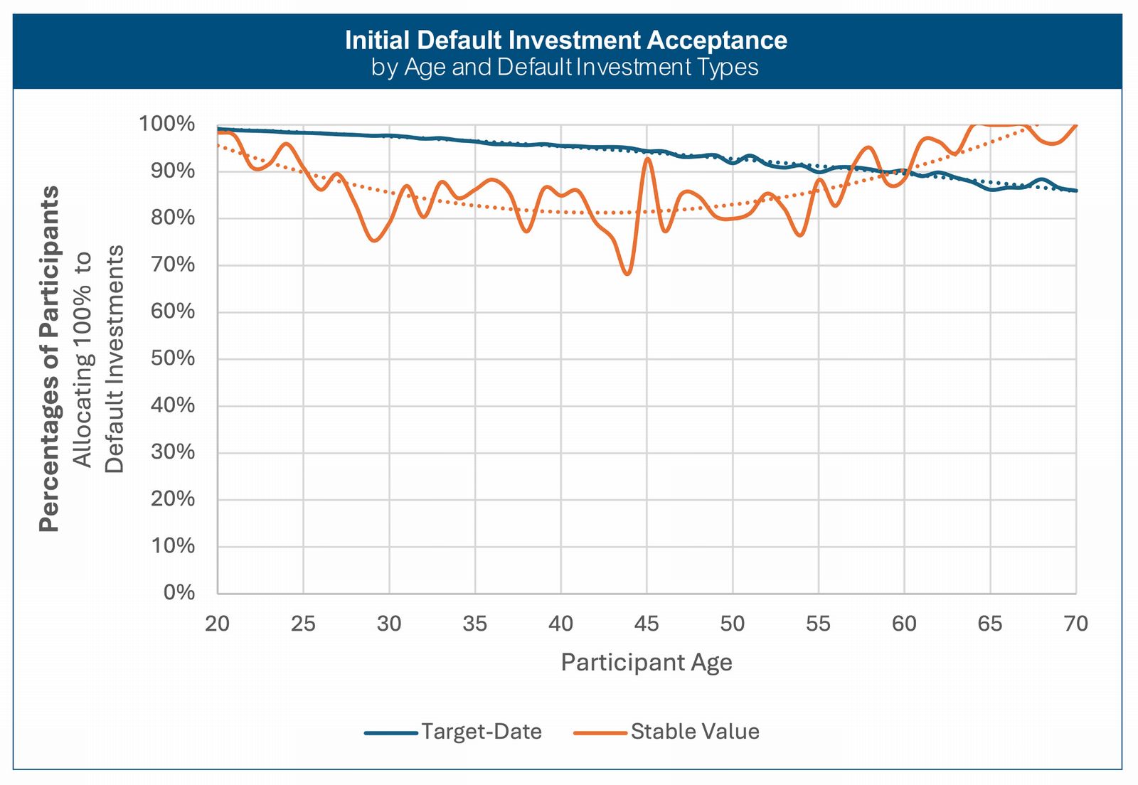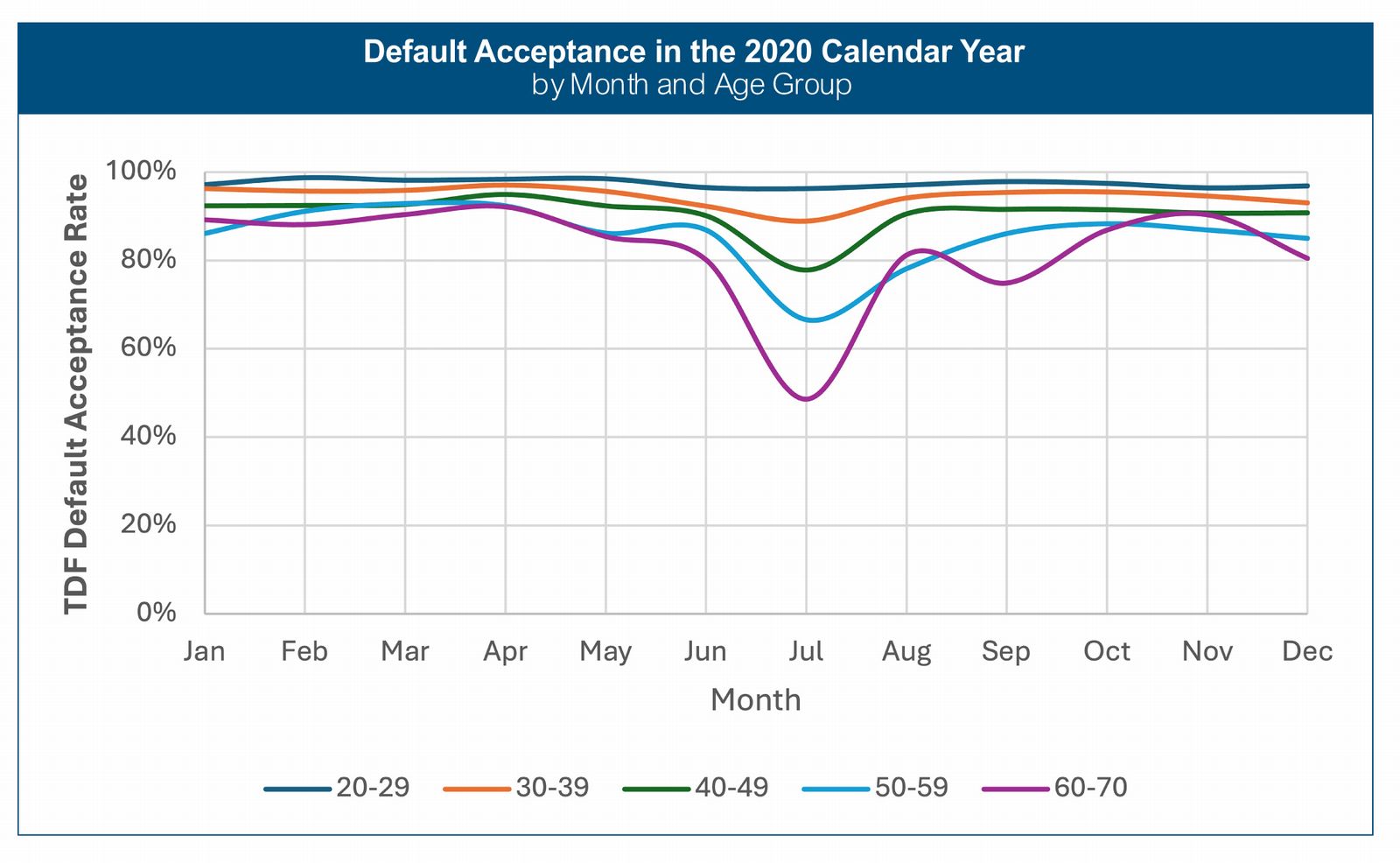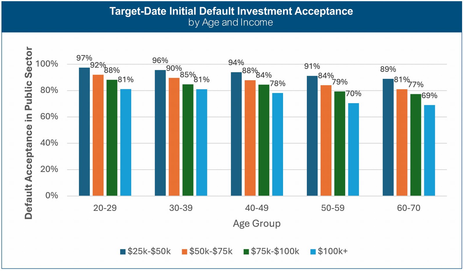 - High Default Acceptance Rates: Over 80% of participants across all age groups accept default investment options, a rate higher than in private sector 401(k) plans.