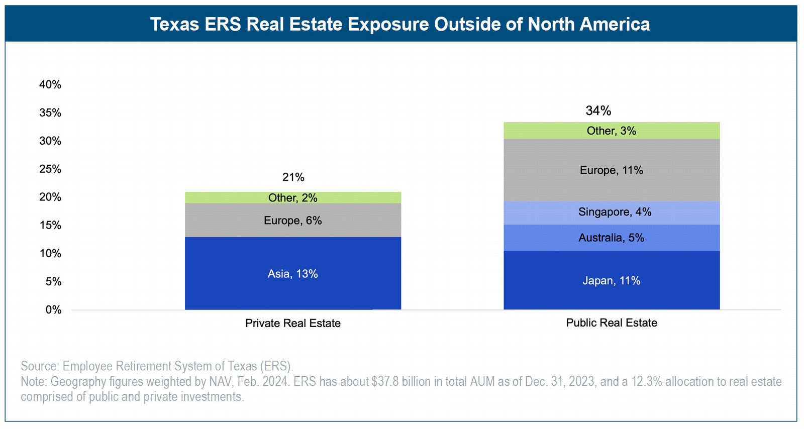 - Employee Retirement System (ERS) of Texas: Texas ERS manages approximately $38.2 billion in AUM and allocates 12% of it to real estate. Within that real estate allocation, ERS has a 25% target for REITs. ERS uses REITs to gain geographic and property sector diversification.