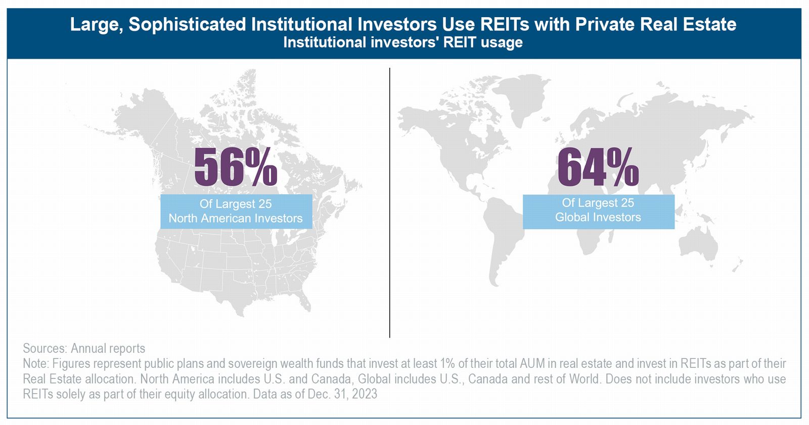 Institutional use of REITs has grown significantly, driven by their ability to meet evolving investment objectives. REITs are utilized in the real estate allocations of close to 60% of the 25 largest North American institutional investors.