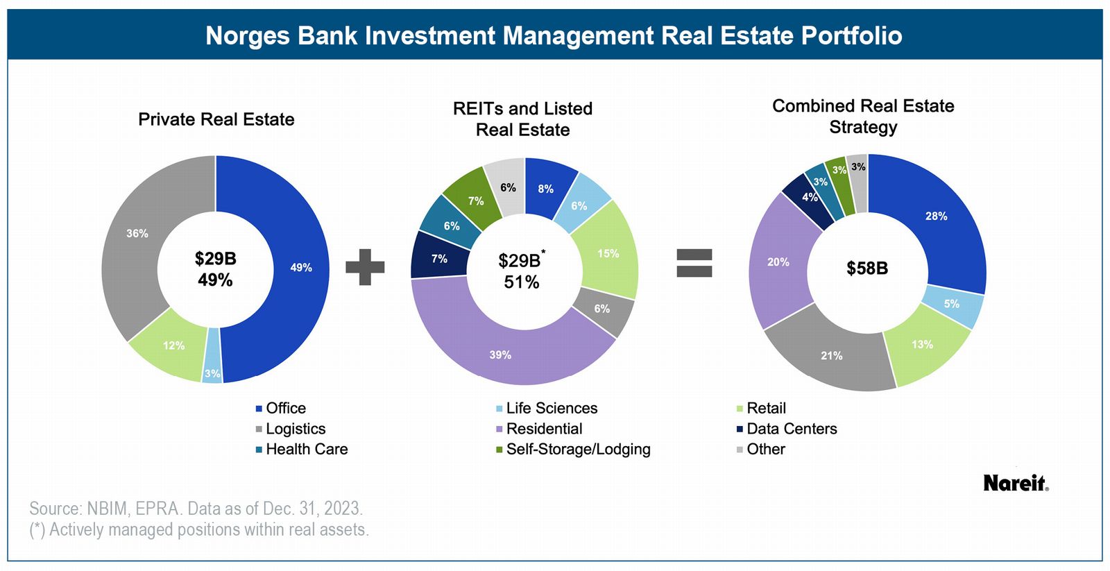 - Norges Bank Investment Management (NBIM): NBIM manages Norway's sovereign wealth fund and oversees $1.7 trillion in AUM, including approximately $58 billion in real estate. It invests 51% in REITs and 49% in private real estate to enhance diversification, access new and emerging property sectors, and optimize cost management.