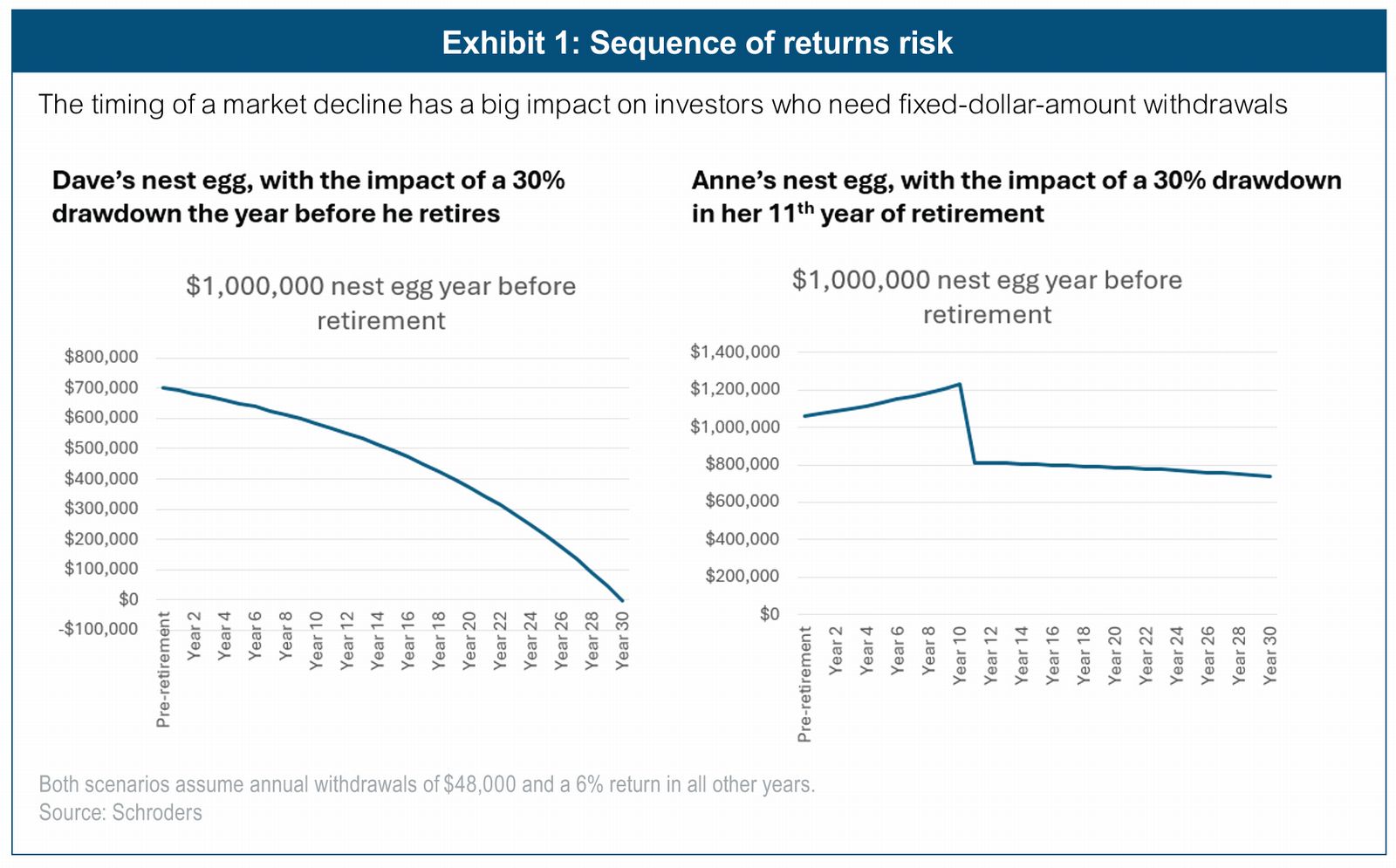 Market declines can have an outsized impact on retirement portfolios when they occur in the early part of someone's retirement, especially when retirees need to withdraw a set dollar amount annually to meet their income needs. Consider a hypothetical example of two investors – Dave and Anne – who have accumulated nest eggs of $1 million and will need to withdraw $4,000 monthly to meet their living needs and supplement Social Security benefits.