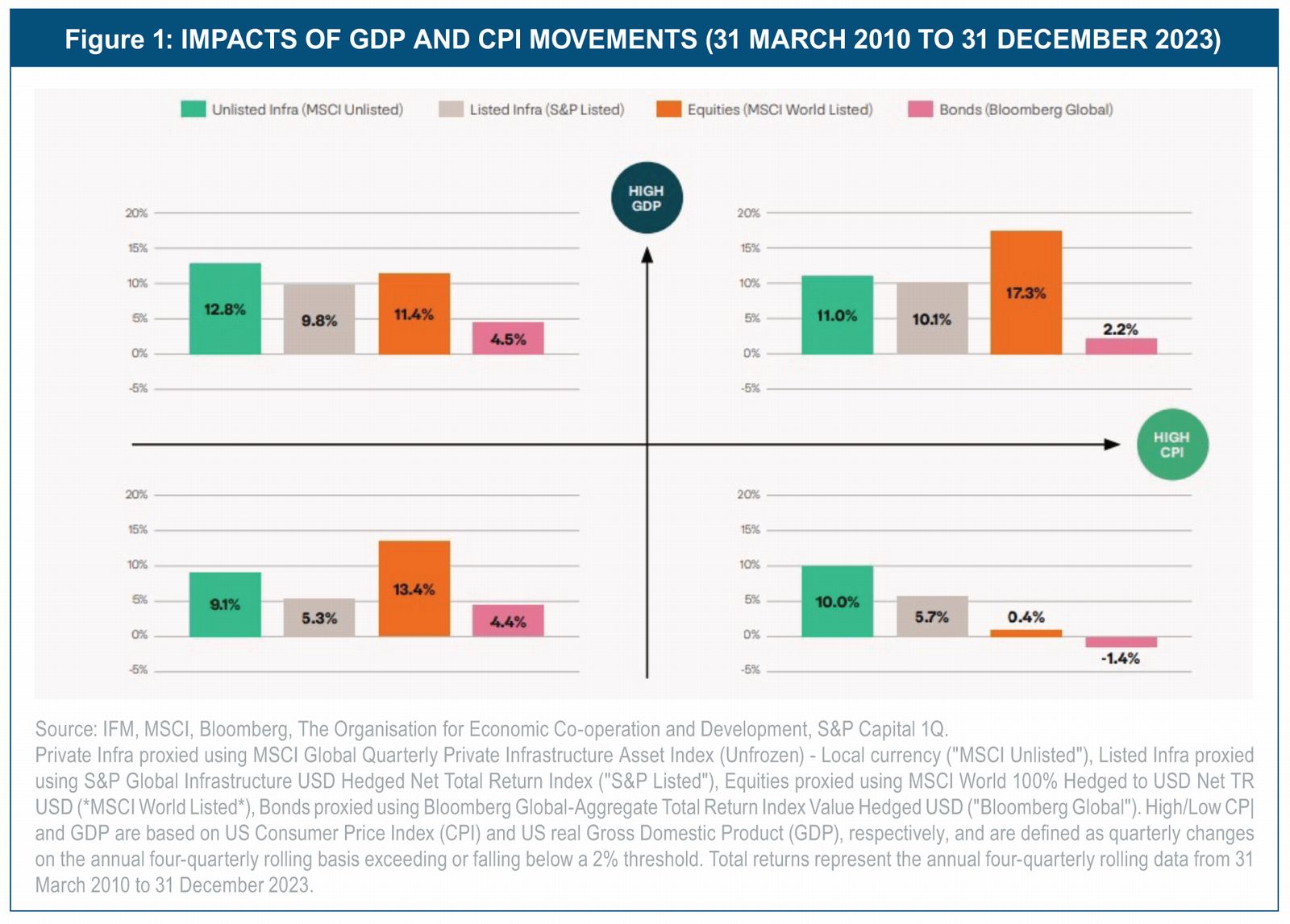 The below figure analysis from March 2010 to June 2023 demonstrates that unlisted infrastructure, represented by the MSCI Global Unlisted Infrastructure Index, consistently delivers returns across different economic scenarios, including varying levels of inflation, interest rates, and economic growth. In Figure 1, we analyzed varying returns from unlisted infrastructure, listed infrastructure, equities and bonds in four scenarios, combining high and low US GDP growth and CPI levels (measured relative to approximate average levels of 2%).