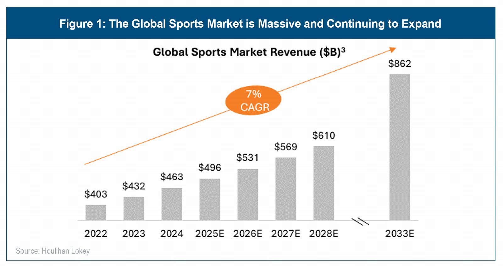The sports, media, and entertainment (“SME”) industry has experienced remarkable growth, propelled in part by skyrocketing demand for sports and sports-adjacent sectors. The global sports industry reflects a massive and growing market, supported by positive secular trends that include increasingly accessible content facilitated by streaming and other platforms, growing consumer spend on live experiences, and rising viewership and fan engagement both inside and outside of the stadium (e.g., e-sports and interactive digital features). As a result of these powerful trends, the global sports market has demonstrated consistent revenue growth, building to what is now a nearly $500 billion market (see Figure 1).