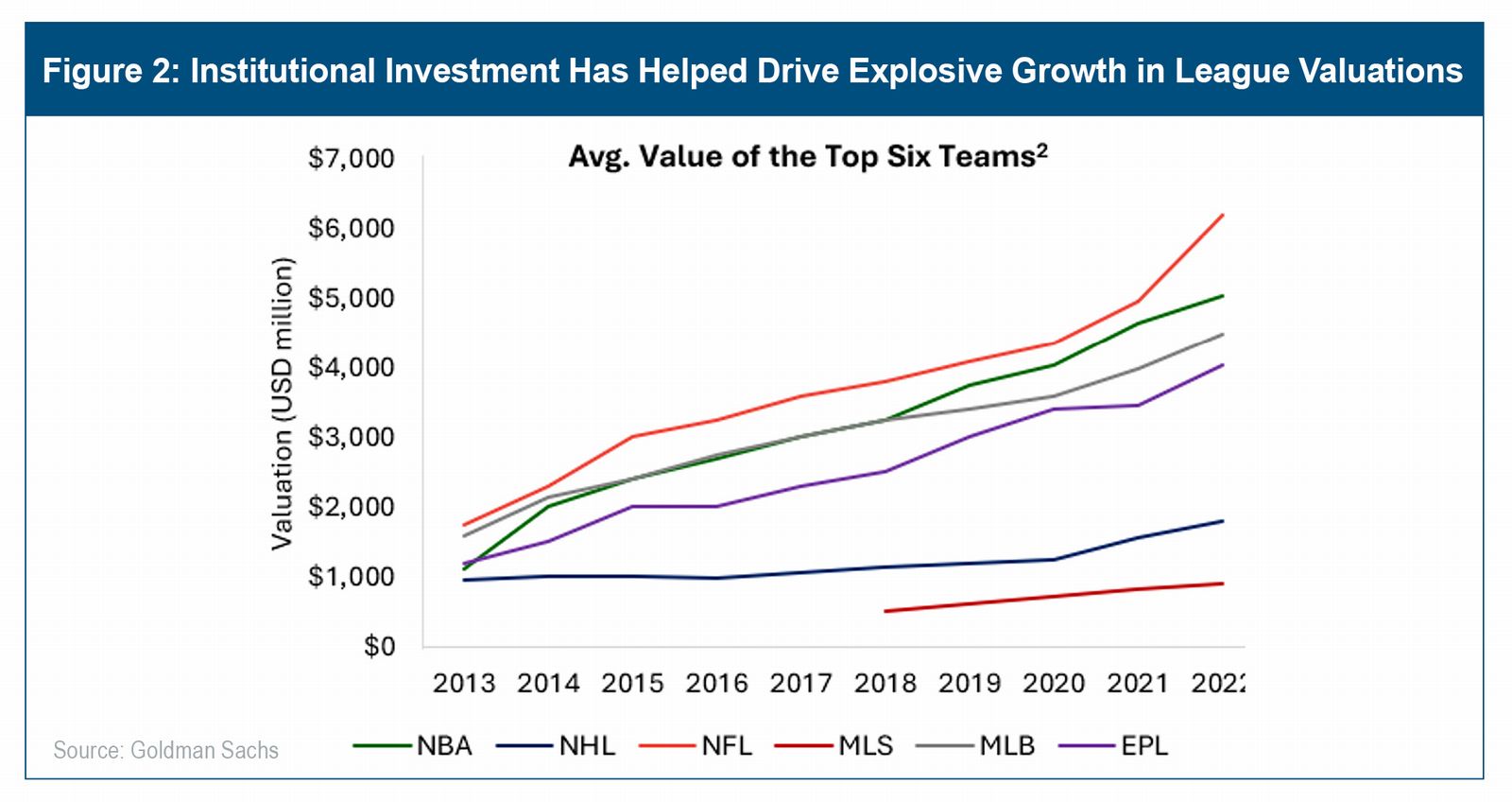 The global appeal and cultural relevance of sports that has grown over the past 10+ years has driven institutional demand for access to sports opportunities. The ability for institutional capital to invest directly into certain of the largest sports leagues has helped boost valuations and spike demand across sports-related transactions generally (see Figure 2). Institutional allocations to sports have grown due to its attractive features: its uncorrelated nature, the scarcity of franchise assets, and the valuable media rights and real estate/infrastructure-related opportunities associated with leagues and teams. Institutional investors' demand for sports-related opportunities is expected to continue; in a recent survey of 507 global sports leaders, over 83% of participants expect institutional allocations to sports to grow over the next 3-5 years.1