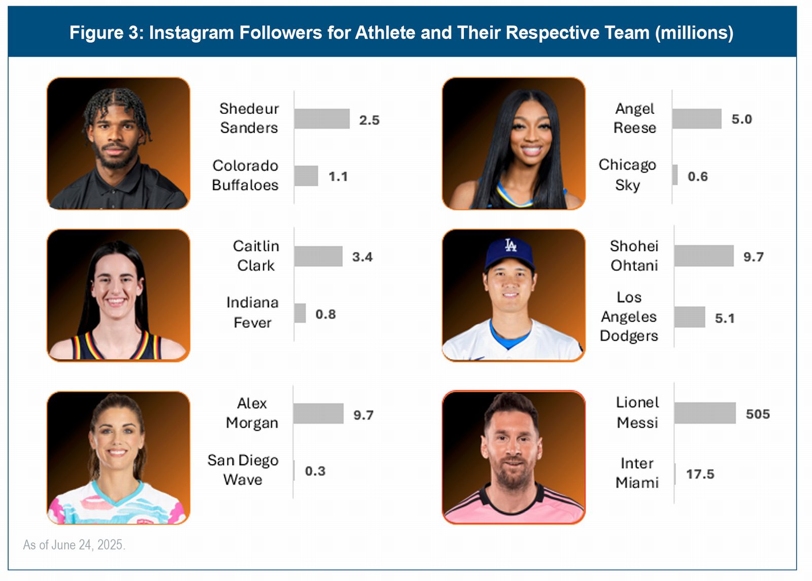 The momentum in demand for sports reaches far beyond areas traditionally associated with the industry, and sports “fandom” is a cultural phenomenon that is widely recognized by a broad range of consumer-facing companies, from the sportswear market to food/beverage companies that can capitalize on fandom through sponsorships and other marketing activations. Driven by the proliferation of social media and diversifying ways to consume athlete-centric products, the phenomenon of sports “fandom” is transitioning from teams to athletes, with focus on the name on the “back of the jersey” versus the logo “on the front”. Athletes are now recognized as multifaceted entrepreneurs, creators, influencers, and cultural icons. To be sure, fans are engaging with athlete content at a significantly greater level than with the teams for which they play (see Figure 3). The traditional paradigm of athletes as mere performers has been replaced by one in which athletes are the value drivers behind sports. This includes record demand for athlete-related products, with the global trading cards and memorabilia market – which is dominated by athlete-centered collectibles – expected to grow at a ~22% CAGR to hit an astonishing $271 billion in revenues by 2024.2 The popularity of individual athletes is impossible to ignore: Inter Miami merchandise sales increased 50x when superstar Lionel Messi joined the team in 2023.3 And since making her professional debut in 2024, WNBA game attendance has been shown to increase 105% when Caitlin Clark is playing.4