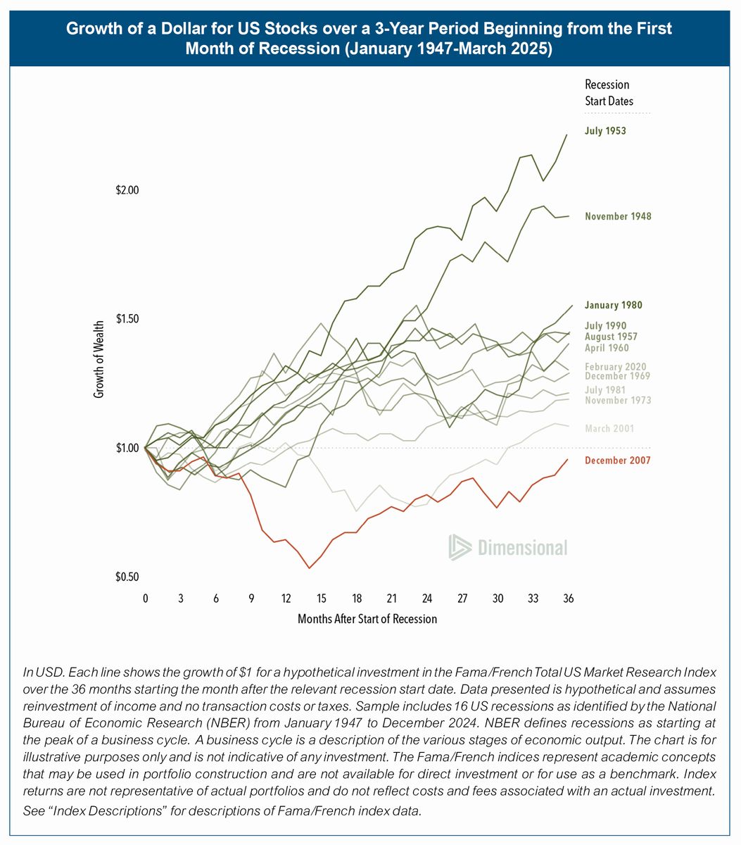 This is borne out in the historical data. One dollar invested at the start of a recession saw positive returns after three years in 11 out of 12 past recessions. The average of the three-year returns after the start of a recession was 43.2%, which is nearly identical to the 41.8% average return of all three-year periods from 1947 to 2024.