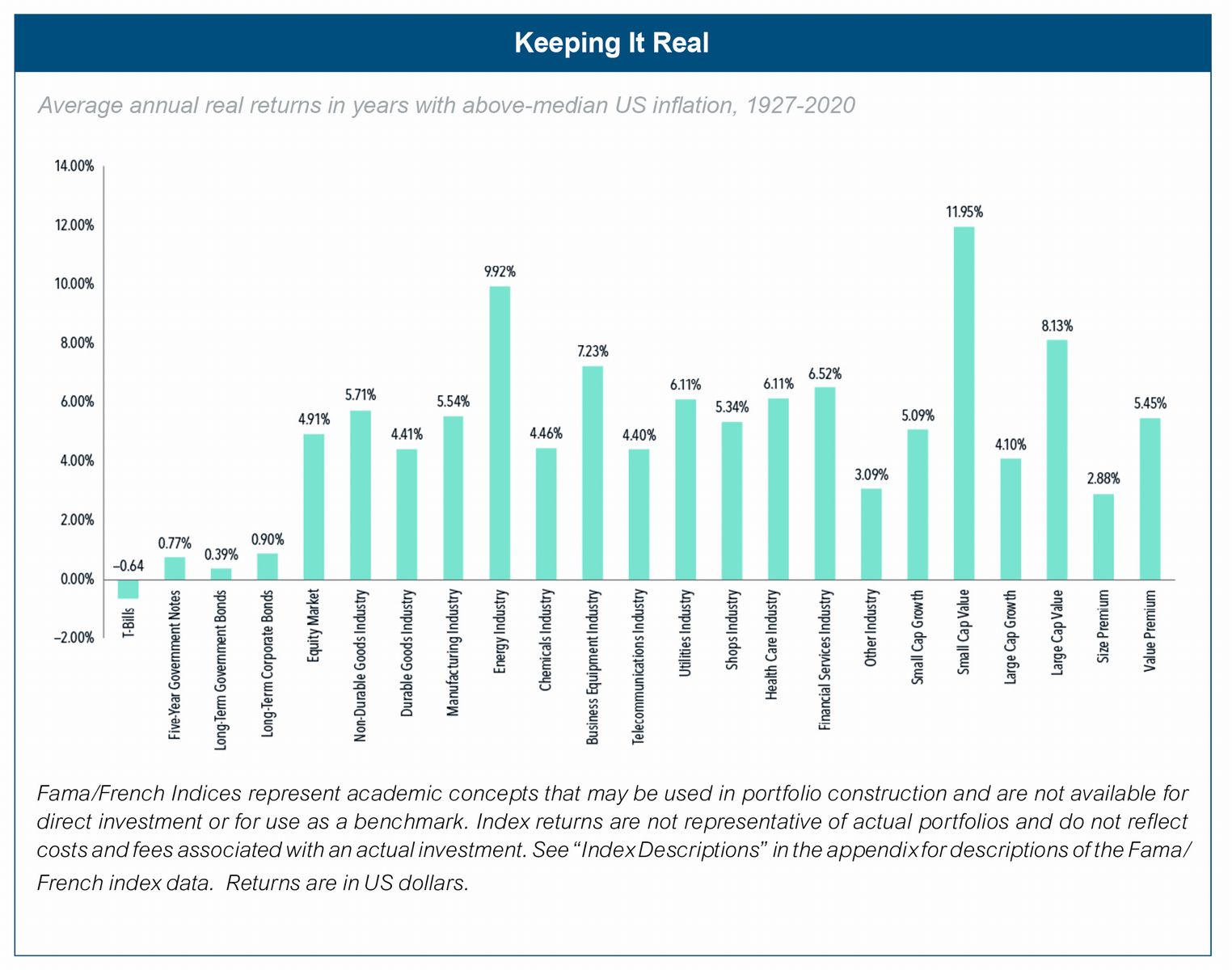 Rising inflation expectations don't necessarily mean investors should take action with their portfolios. Expected inflation is continuously incorporated into current market prices. Stock and bond market prices should be set to a level where expected returns compensate investors for the effects of inflation. This is consistent with the long-run data, which show that most stock and bond market segments have had positive average real returns even in years with high inflation. So, if actual inflation pans out similarly to expectations, investors can likely stay the course with their current asset allocation.