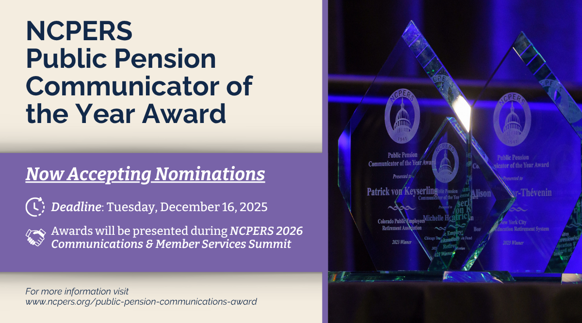 NCPERS is pleased to announce that we are now accepting nominations for the third annual Public Pension Communicator of the Year Award. This award honors staff members at public pensions who have demonstrated exceptional leadership skills; shown superior innovation and creativity; and created a positive impact with their communications or member services work in the preceding year.