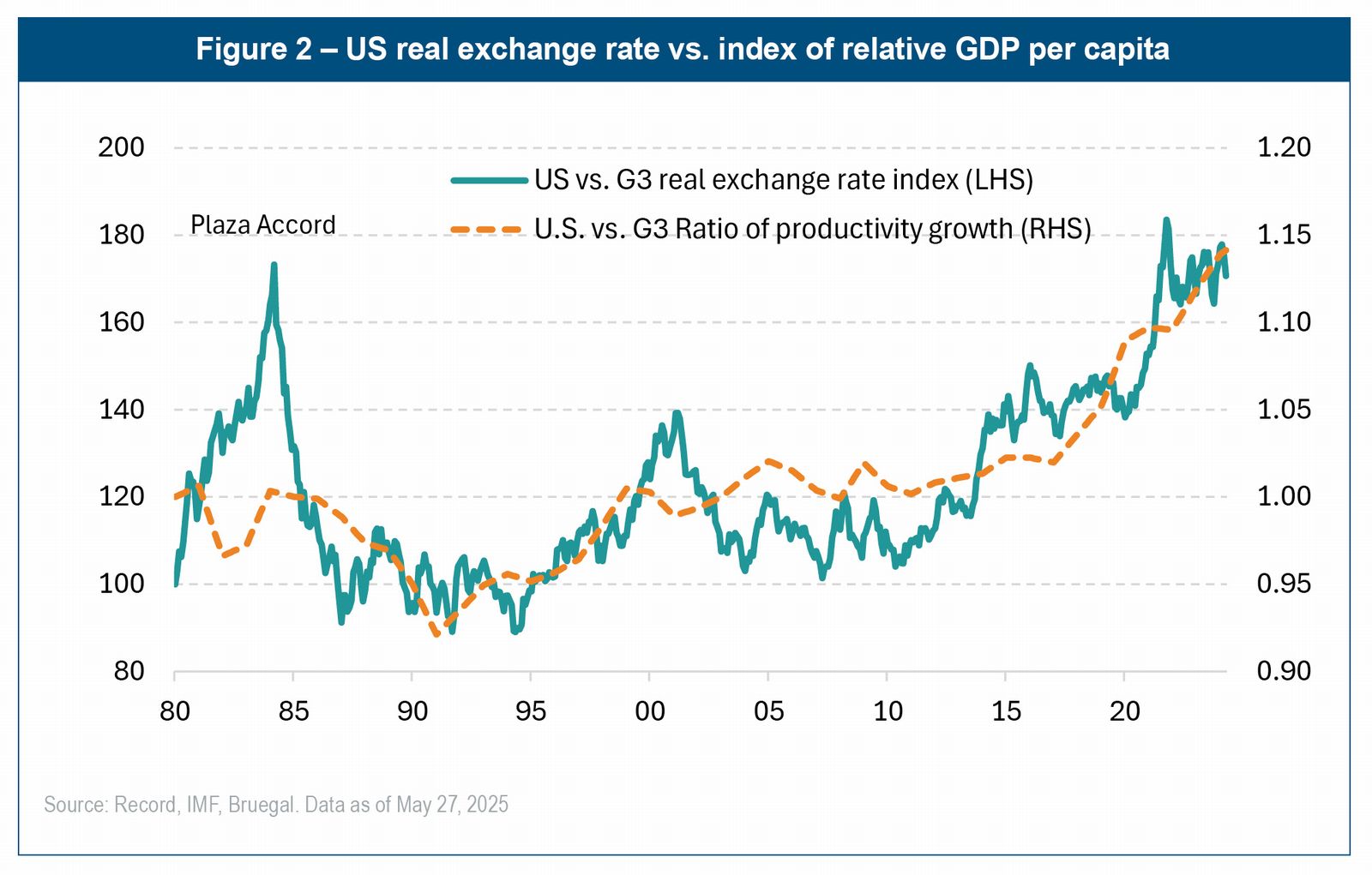 Persistent twin fiscal and trade deficits have long characterized the US economy. Yet, the dollar's “exceptionalism” has persisted through strong relative productivity growth which generates value misalignments, and geopolitical insulation with strong demand for US assets during risk-off periods.