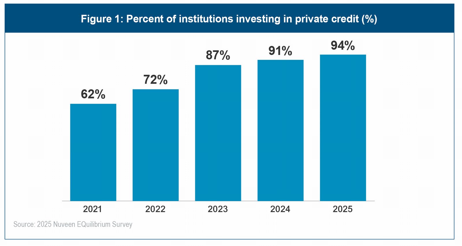 Nuveen's latest EQuilibrium survey shows that 94 percent of institutional investors now hold private credit in their portfolios, marking a significant jump in the last five years. At the same time, investors are reengaging with public fixed-income markets with the recent rise in yields.