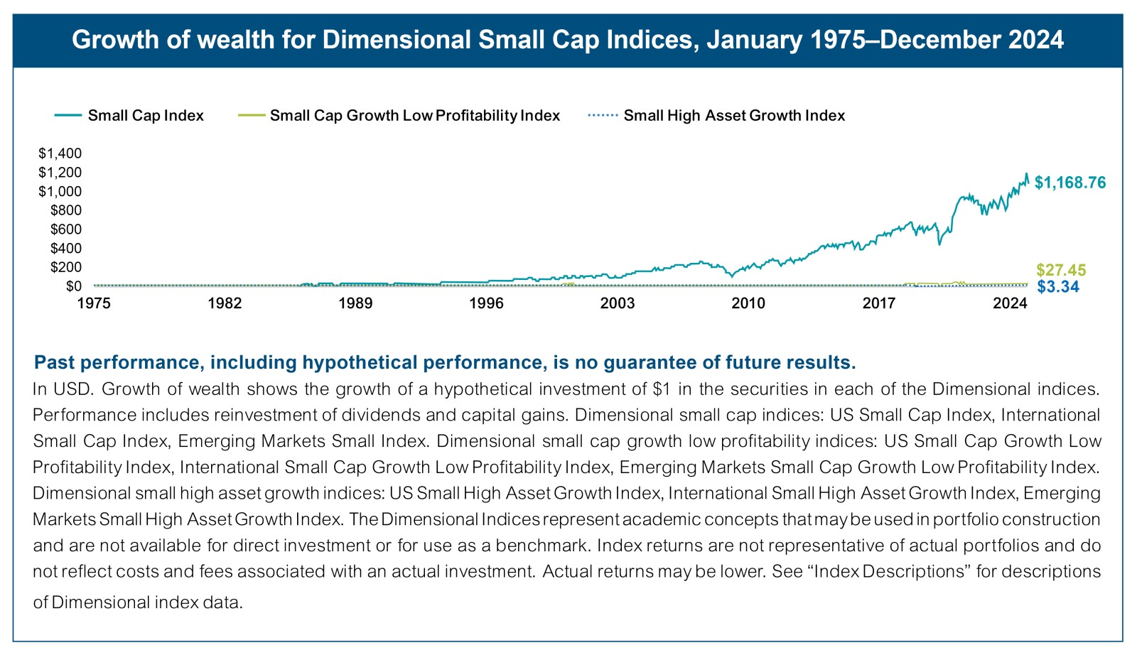 Dimensional US Small Cap Index was created by Dimensional in March 2007 and is compiled by Dimensional. It represents a market-capitalization-weighted index of securities of the smallest US companies whose market capitalization falls in the lowest 8% of the total market capitalization of the eligible market. The eligible market is composed of securities of US companies traded on the NYSE, NYSE MKT (formerly AMEX), and Nasdaq Global Market. Exclusions: non-US companies, REITs, UITs, and investment companies. From January 1975 to the present, the index excludes companies with the lowest profitability and highest relative price within the small cap universe. The index also excludes those companies with the highest asset growth within the small cap universe. Profitability is measured as operating income before depreciation and amortization minus interest expense scaled by book. Asset growth is defined as change in total assets from the prior fiscal year to current fiscal year. Source: CRSP and Compustat. The index monthly returns are computed as the simple average of the monthly returns of 12 subindices, each one reconstituted once a year at the end of a different month of the year. The calculation methodology for the Dimensional US Small Cap Index was amended on January 1, 2014, to include profitability as a factor in selecting securities for inclusion in the index. The calculation methodology for the index was amended in December 2019 to include asset growth as a factor in selecting securities for inclusion in the index.