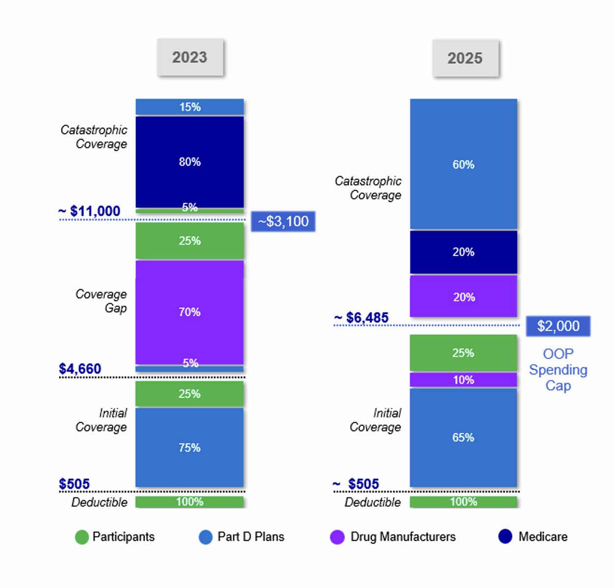 By 2025, the Medicare Part D plan design will cap participant out of pocket spending at $2,000 and alter the cost sharing between the participant, the Part D Plan, the drug manufacturers and Medicare. The chart below shows how this will work.