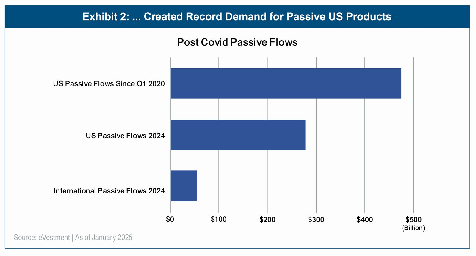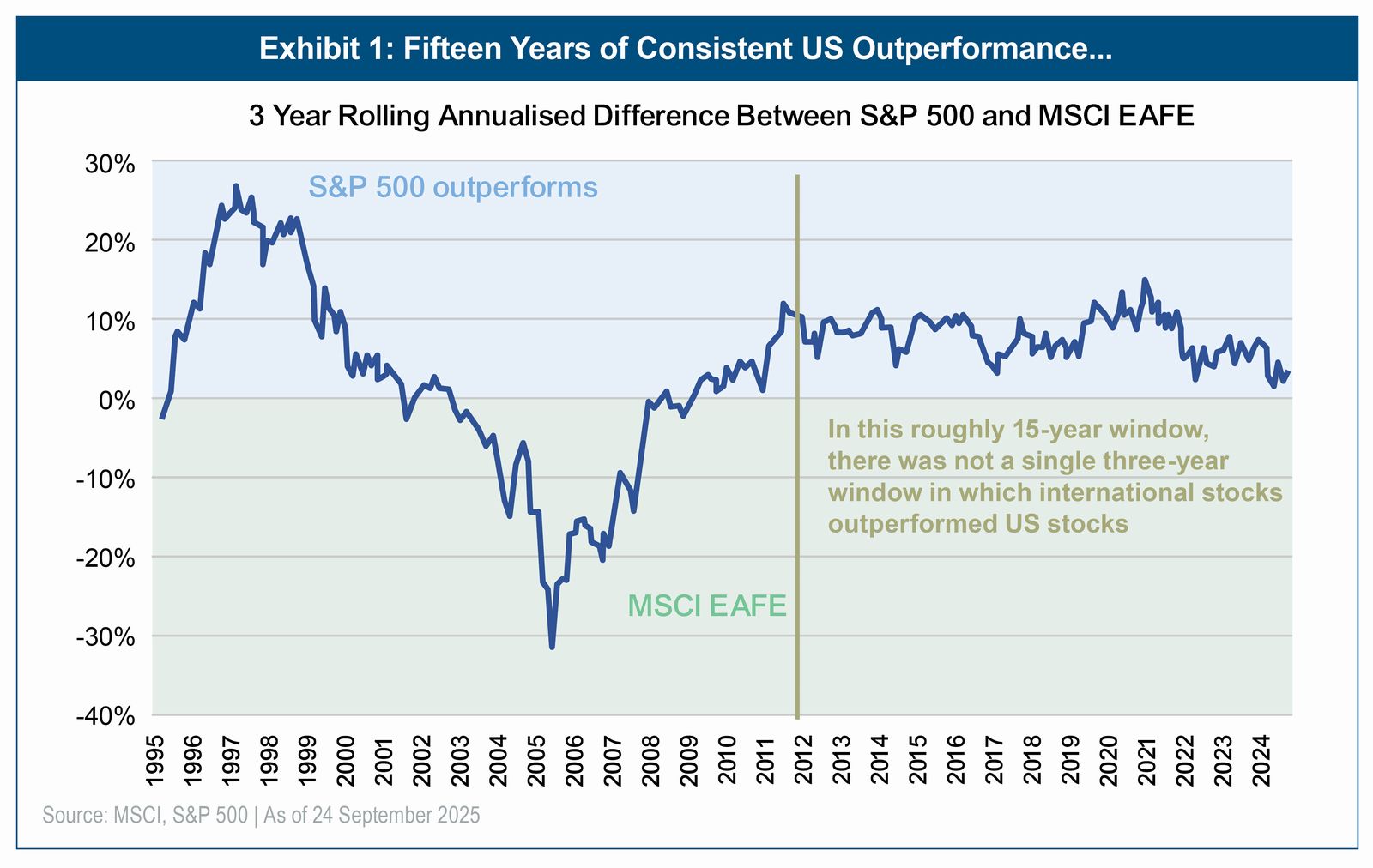 For the better part of two decades, US outperformance was the defining theme of developed markets. From 2009 to 2024, the S&P 500 outperformed EAFE by 8.1% on average each year—a notable departure from prior decades where the two regions delivered comparable annualized returns of approximately 9%. Even more remarkable was the consistency over time: from 2009 to 2024, there were only three years where US stocks underperformed international stocks (2015, 2017, 2022) and in each case, that underperformance was less than 3%.2 The three-year rolling difference between the S&P 500 and MSCI EAFE shows that at any given month-end in that fifteen-year window, a three-year buy-and-hold of overweighting US stocks and underweighting international stocks would have resulted in three years of mostly-significant outperformance (Exhibit 1). By 2024, the term “American Exceptionalism” had become common shorthand for the seemingly unstoppable rise in US stock indices3 and the lure of steady double-digit market returns created an extraordinary appetite for passive US products (Exhibit 2). Complacent faith in US growth had become so mainstream that t-shirts sporting the phrase “VOO and Chill”—meaning invest in Vanguard's S&P 500 ETF and sit back while steady, reliable returns accumulate4—could be found at Amazon and Walmart.5