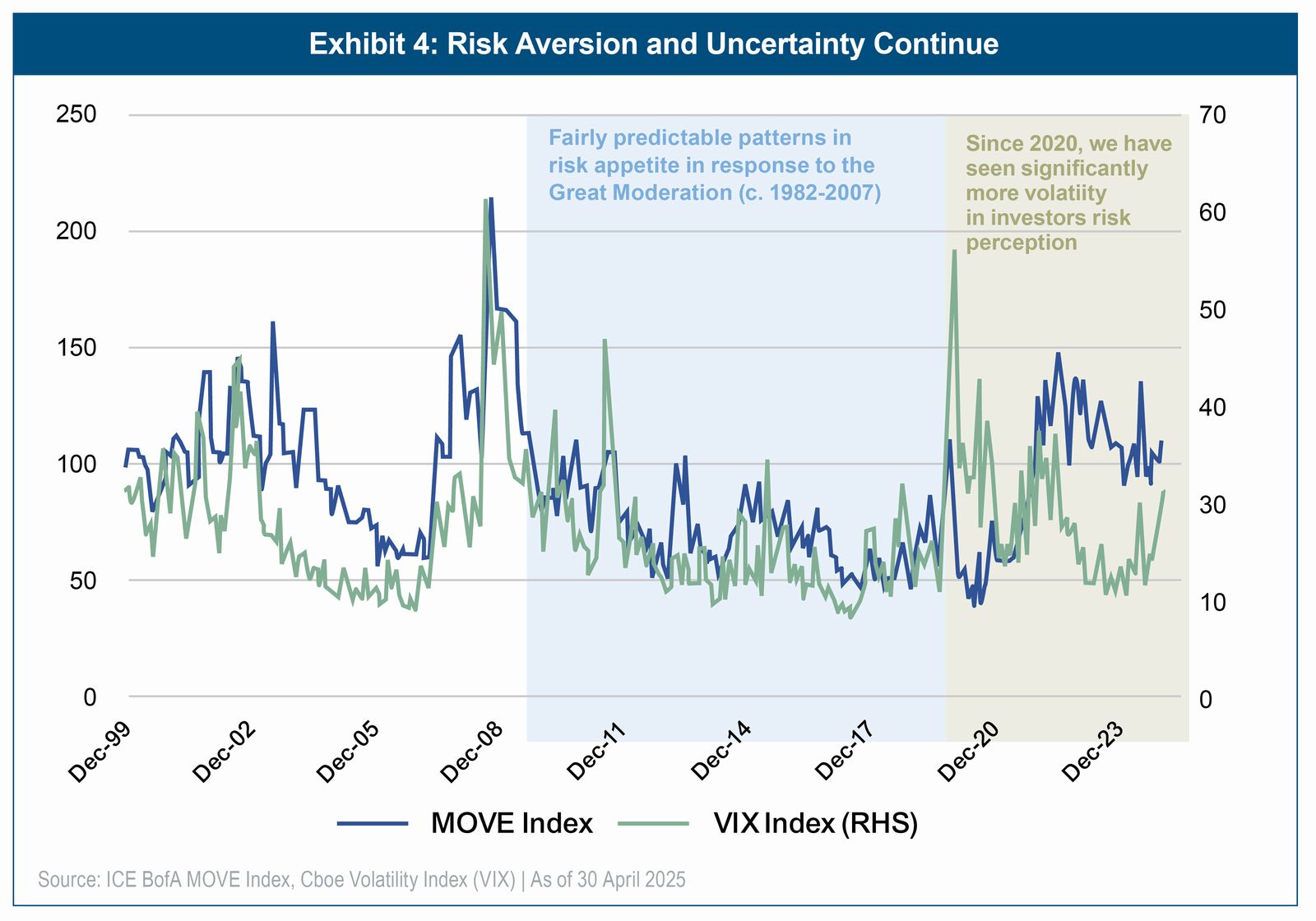 We also believe the speed and scale of this volatility compounded the sense of uncertainty reflected in two key measures of investor sentiment: the ICE BofA MOVE Index (a measure of expected volatility in government bond yields) and the VIX Index (a measure of expected volatility of the S&P 500, often called the “fear index), both of which have spent most of the risk exhaustion period at higher levels than in the 2010s—a period defined by falling interest rates, stable inflation, and low macroeconomic uncertainty (Exhibit 4).