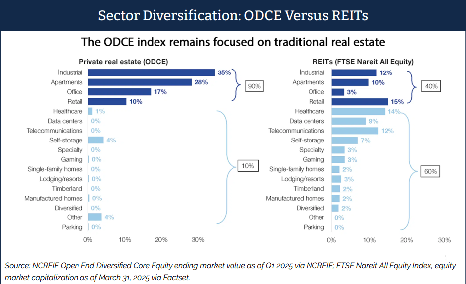 The chart above shows that the NFI-ODCE index remains heavily concentrated in legacy sectors — office, retail, apartment, and industrial. Meanwhile, REITs provide liquid, scaled access to the specialized operating platforms defining the modern economy, such as data centers and cell towers. By using REIT strategies, institutional investors can target high-growth sectors that are difficult to aggregate privately, enhancing portfolio resilience.