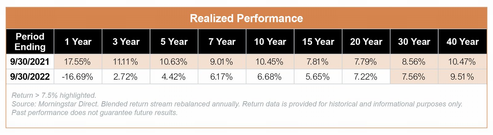 To further illustrate this point, consider that most client portfolios were recently faced with an example of the extreme impact that end point sensitivity can have on the presentation of trailing results. The table below contains the trailing benchmark performance of a traditional balanced investment portfolio (50% Russell 3000 / 10% MSCI EAFE / 40% Bloomberg US Aggregate) using two different endpoints one year apart. As you can see, adding 2022's negative performance to the trailing period calculations has a significant impact on the presentation of long-term performance results. To further visualize how a cursory review of these results could potentially lead to inaccurate snap judgements of portfolio success or failure, we also highlighted returns above 7.5% as a reference point for a hypothetical pension plan's assumed rate of return.
