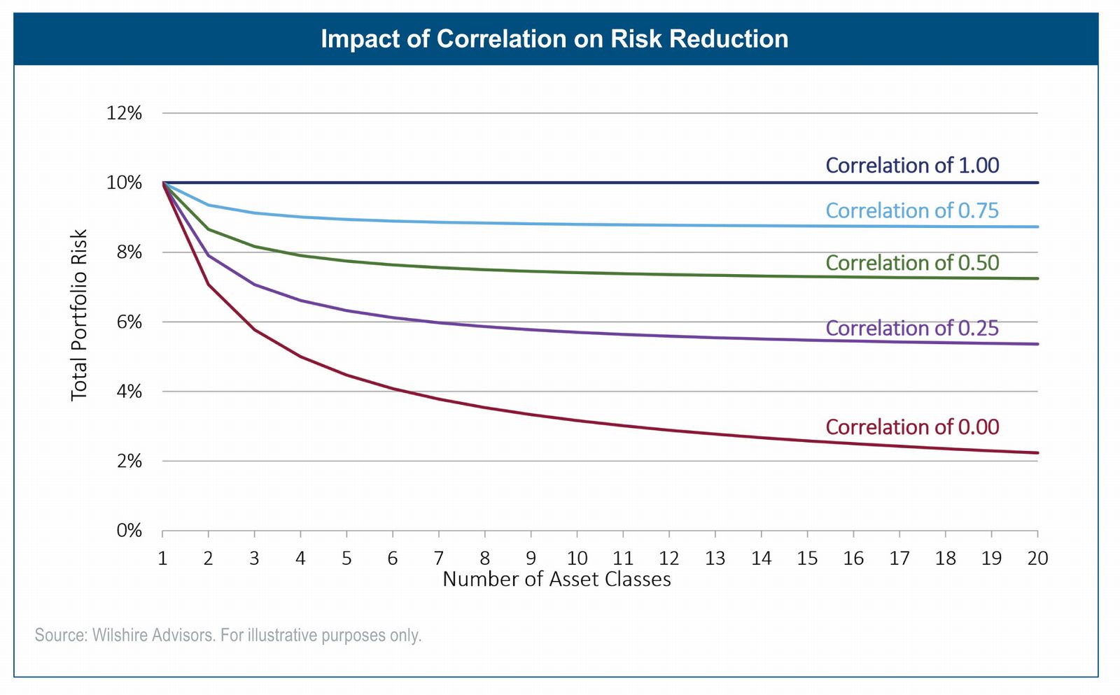 The importance of diversification stems from asset classes having different correlations – the movement of asset class returns in relation to one another. Increasing the number of asset classes across a portfolio can reduce total portfolio risk.