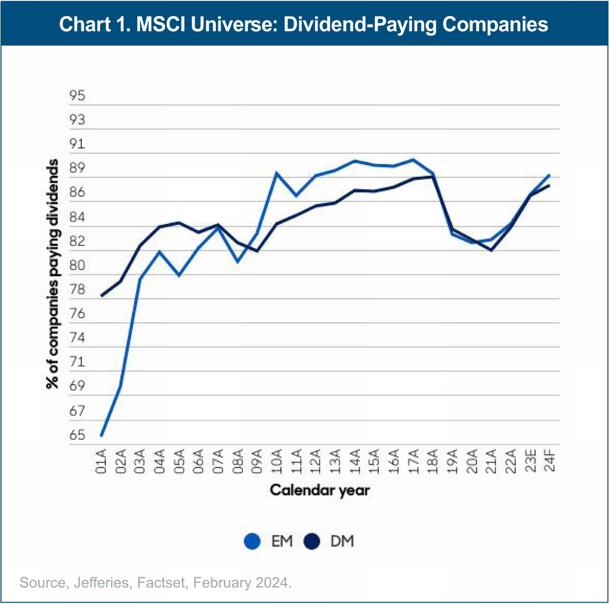 Evidence is mounting that EMs are a fertile hunting ground for income, not just capital growth. The proportion of EM companies paying a dividend has grown significantly over the last two decades, with around 90% now doing so (and more than one-third of these yielding over 3%) (Chart 1).1,2