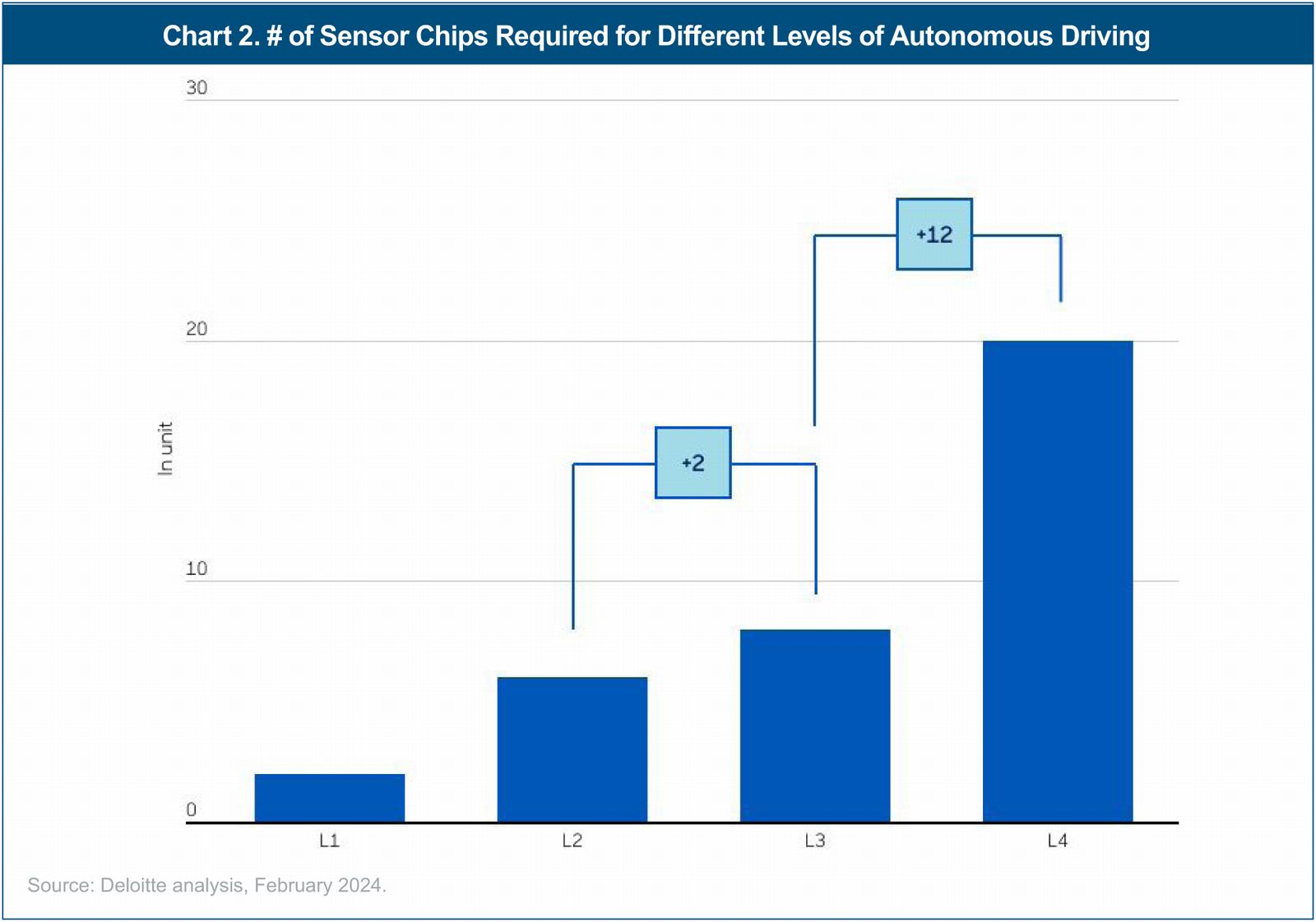 Smarter technology in transport also comes with huge demand for additional sensors and components. Electric vehicles need more sophisticated chips and in greater numbers than the more conventional internal combustion engine cars.3 Autonomous vehicles require even more (Charts 2 and 3). Essential functions such as judging road positioning and making split-second safety decisions need large technology sets, including GPS, radar, and lidar.4