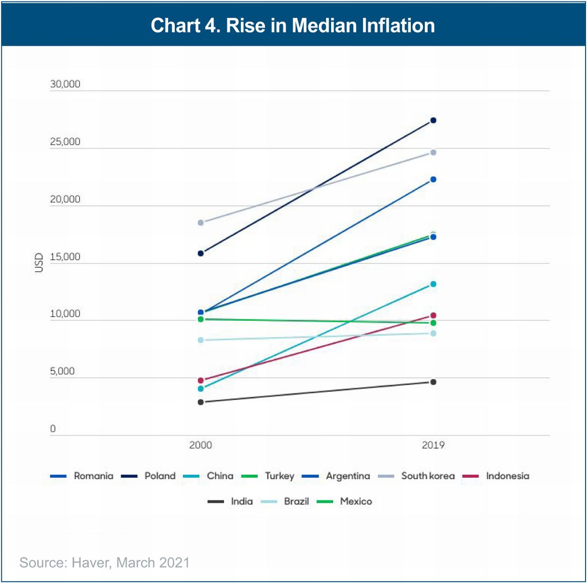 Spending power is rising dramatically in EM. Nations including India and Indonesia have seen large increases in their working-age populations. Together with fewer people having to support dependents, this is a recipe for potentially much greater economic growth. While the precise definition of middle class can vary, median income has increased substantially across many EM countries in recent years (Chart 4).5