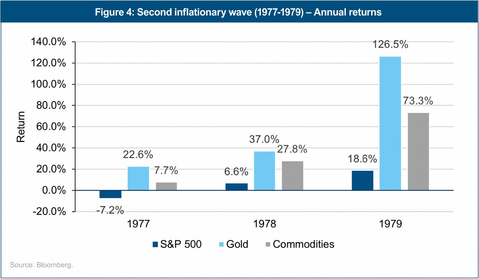 The back-and-forth positioning at the Fed had a tremendous impact on the economy, as policy was not sufficiently tight enough to quell long-term inflation. In addition, policy mismanagement substantially restrained traditional investor returns. By virtue of the several recessions and two substantial inflationary waves brought on by the stop- and-go policies, the real return on a 60/40 portfolio was a paltry 0.19% per year from 1969-1982. At the same time, however, commodities experienced substantial real returns of 15.10% per year, driven at first by the energy supply shock, and then during the second inflationary wave, by gold.