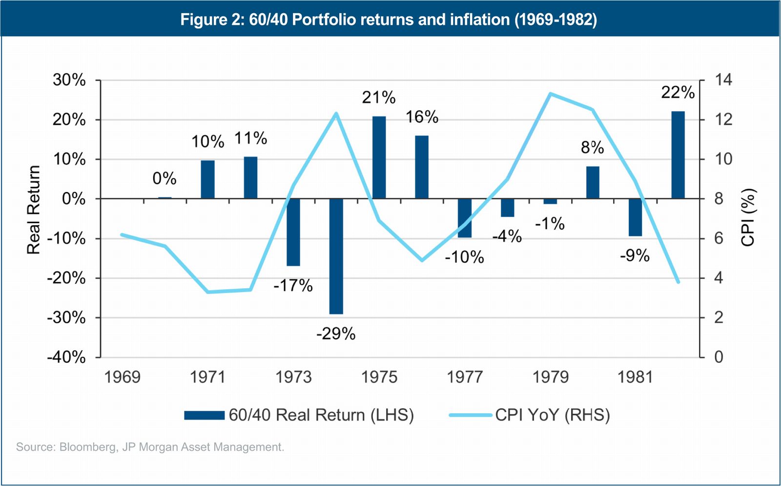 The challenges of a half-century ago bear an uncanny resemblance to the risks that we face today. In the 1970s, real returns on traditional 60/40 portfolios were eroded to almost nothing due to a mix of domestic political troubles, conflicts in the Middle East and, most directly, recurring waves of inflation. If this sounds familiar, institutional investors may need to consider allocating to an alternative asset class to preserve portfolio returns. Using history as a guide, we believe commodities may be an appropriate fit.