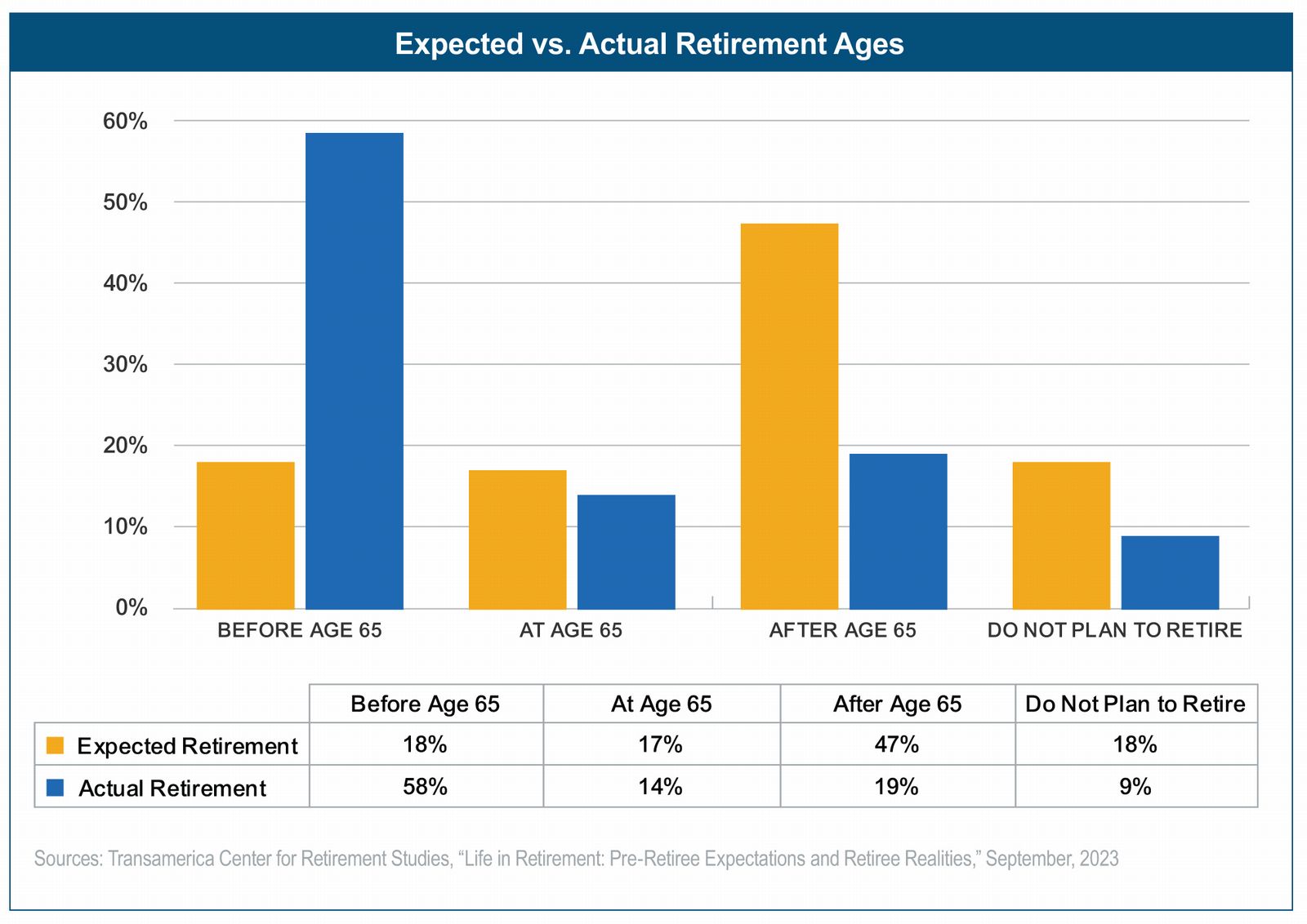 When surveyed about their retirement fears, the primary concern for workers age 50 and older was “outliving my savings and investments,” at 45% of respondents. Additionally, many people don't work as long as originally planned for a variety of reasons. Cutting short a savings horizon in this manner further hurts already low account balances. Expected and actual retirement patterns are illustrated in the following graph.