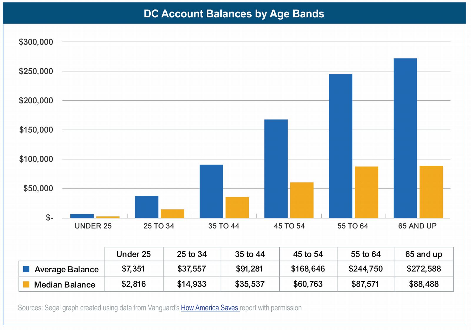 One criticism made with analyzing DC account balances like this is, due to potential job movement without electing rollovers, some people may have more than one account. But even quadrupling the highest median account balances shown results in amounts lower than the present value at retirement for a standard defined benefit (DB) plan lifetime annuity.