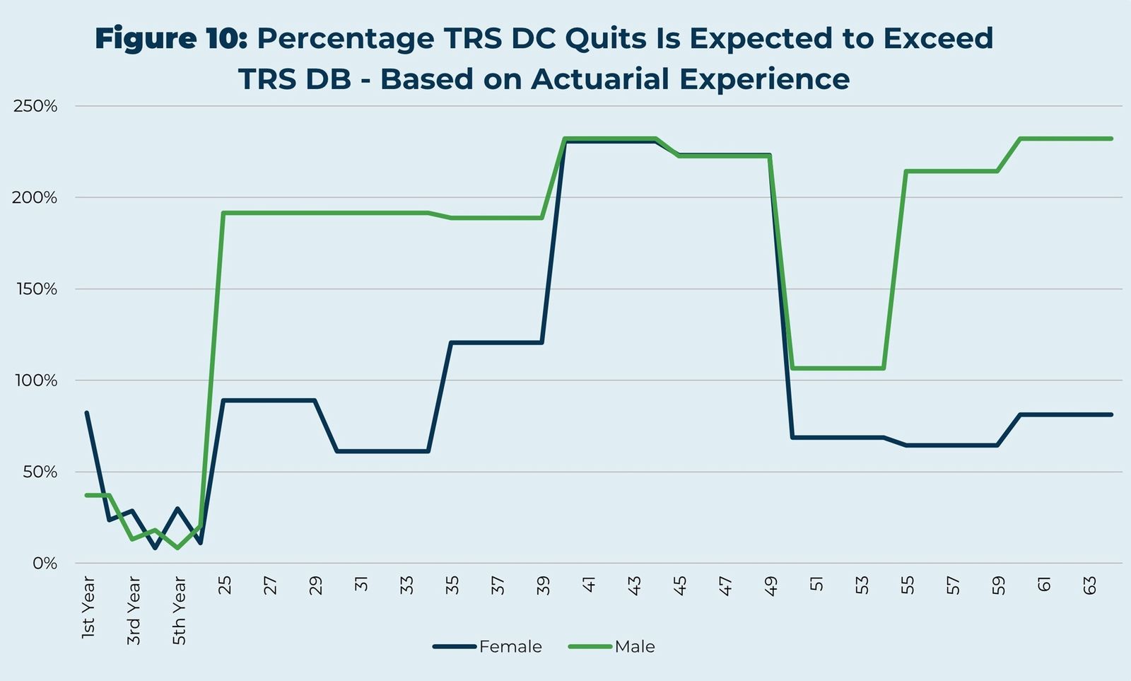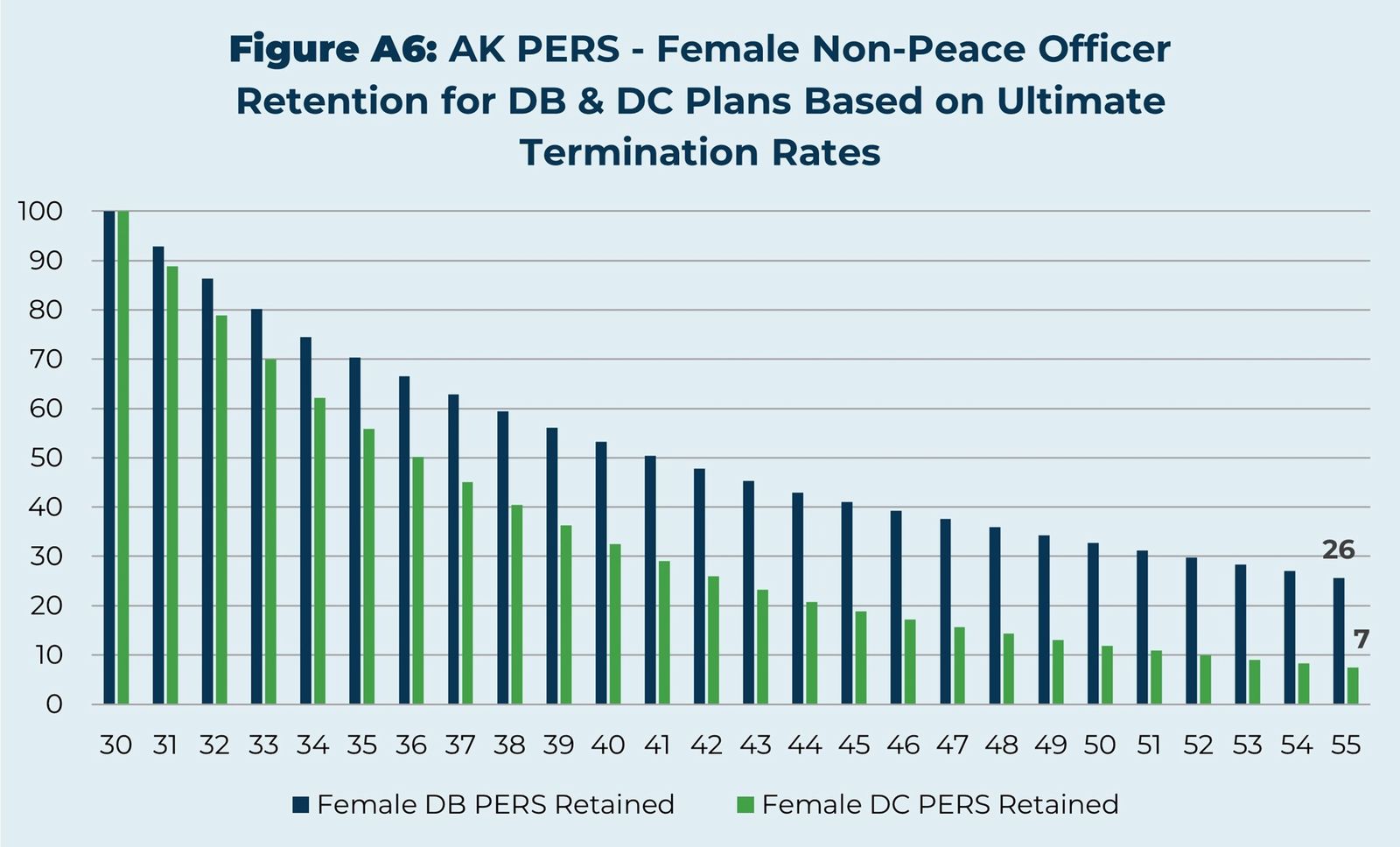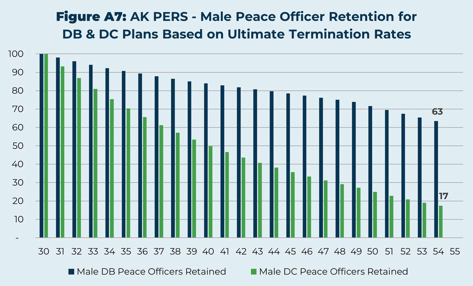 The actuary for the two closed Alaska plans tracks the employee turnover data for both the defined benefit (DB) and the defined contribution (DC) plans. Employee turnover is much higher in the DC plans than in the DB plans. This data can be used to project the years of expected service in the two plans. For example, for a group of 100 male peace officers vesting in their plan at age 30, the DB plan would expect to still have 63 of them working at age 54, but the DC plan would only expect to have 17 of those 100 still working then. Similarly, for 100 female general government employees, 26 of 100 would be expected to still be working at age 55 in the DB plan, but only 7 of those in the DC plan. Put another way, the state expects to receive 67 percent more service from male peace officers in the DB plan, and 51 percent more service from female general government employees in the DB plan.